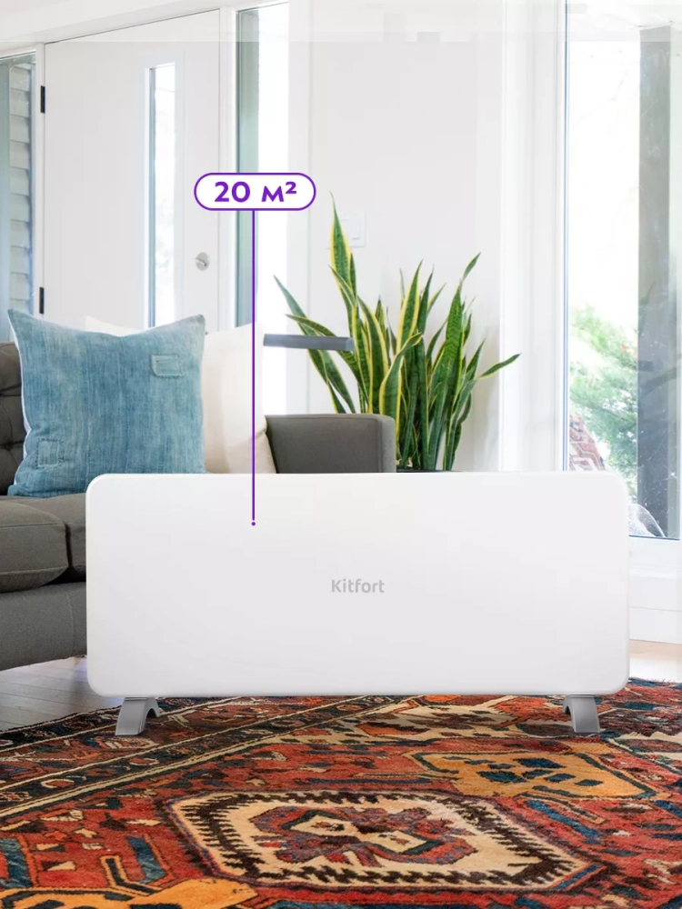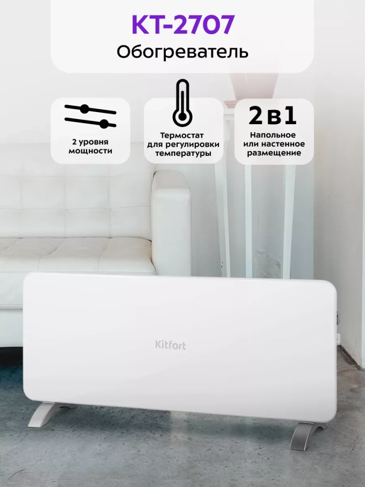 Обогреватель Kitfort KT-2707 предназначен для использования в квартирах, загородных домах, офисах. Прибор имеет два уровня мощности и механический термостат для регулировки температуры.