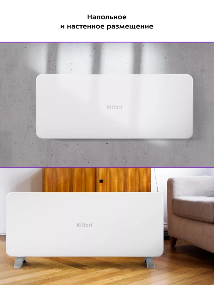 Устройство предназначено для напольного и настенного размещения. В комплекте идут ножки для установки обогревателя на пол и комплект крепежа для крепления устройства на стену.
