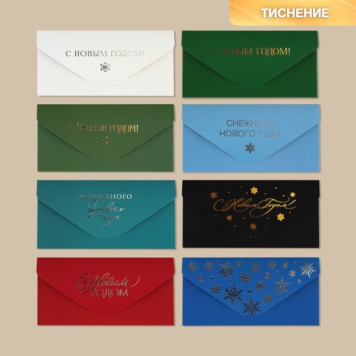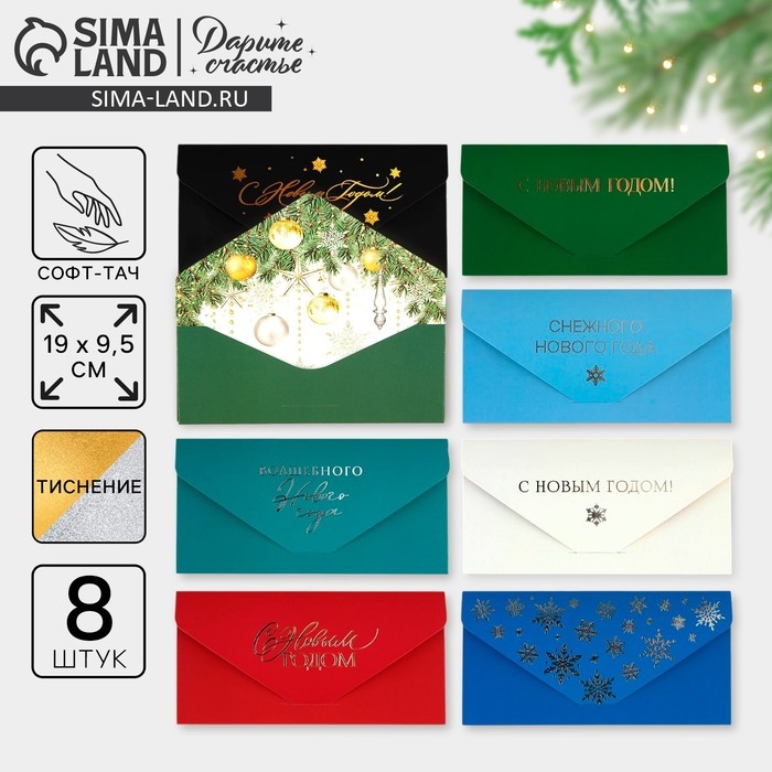Конверт для денег, набор 8 штук, «С Новым годом», софт тач, тиснение, 19 х 9.2 см, Новый год