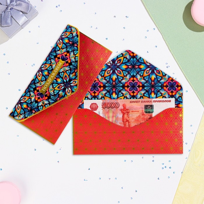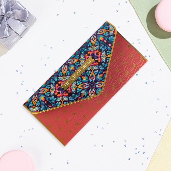 Конверт "Поздравляем!" вырубка, конгрев, тиснение, синие узоры
