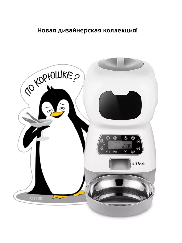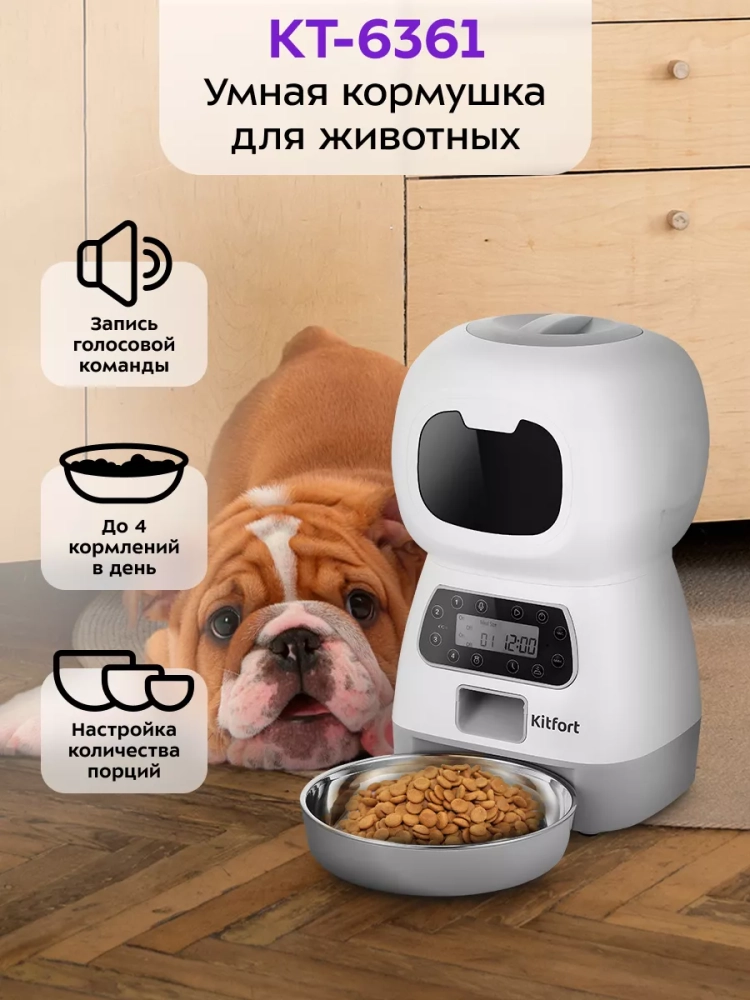 Умная кормушка для животных Kitfort KT-6361 позволяет соблюдать необходимый режим кормления домашнего питомца во время вашего отсутствия. С помощью умной кормушки вы можете настроить до 4 приемов пищи в сутки, а также отрегулировать количество порций в каждом кормлении. Для привлечения внимания питомца к кормушке в устройстве есть функция записи голосовой команды. Это позволяет облегчить процесс привыкания питомца к новому устройству.