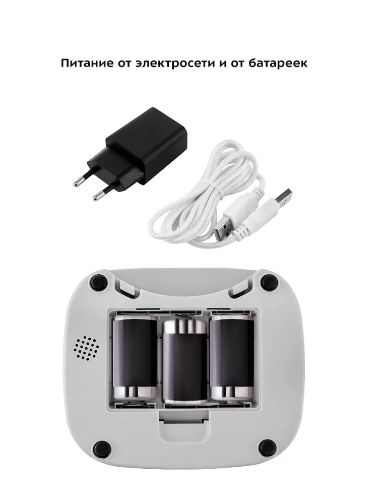 Прибор работает от трех батареек типоразмера D (не входят в комплект). Это позволяет использовать умную кормушку в любом удобном для вас месте. Также вы можете подключить умную кормушку к электросети с помощью USB-шнура и блока питания с выходными параметрами =5 В, 1 А (входят в комплект).