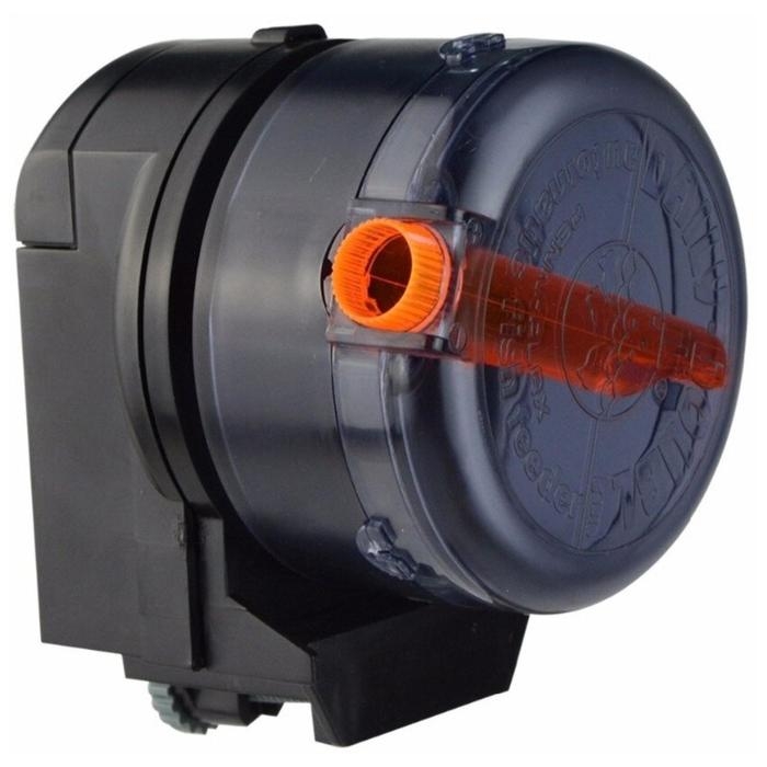 Корм засыпается в перфорированный барабан. В нужное время из него подается корм в строго определенной порции. Регулировать количество высыпаемой смеси позволяет специально установленная пластина, уменьшающая объем барабана.