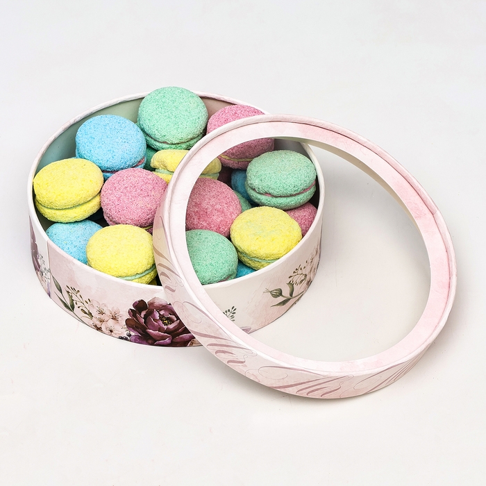 Тубусный дизайн обеспечивает удобство и практичность при упаковке макарун, сохраняя их форму и свежесть во время транспортировки. Однако настоящий шик этой коробки проявляется благодаря инновационному окну, которое позволяет вашим клиентам или получателям любоваться изысканными цветами и текстурой макарун, даже не открывая упаковку.