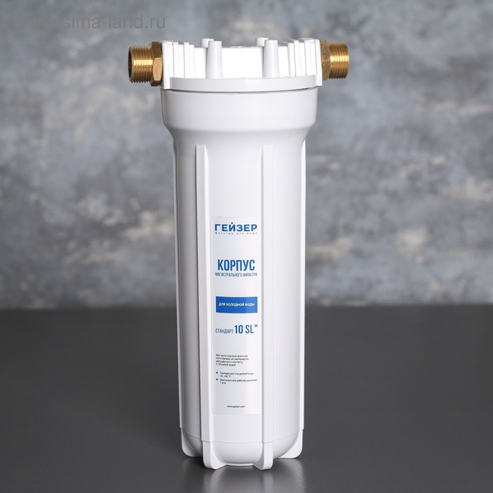 Корпус «Гейзер 10SL ¾» изготовлен из прочного белого полипропилена с металлическими ниппелями.