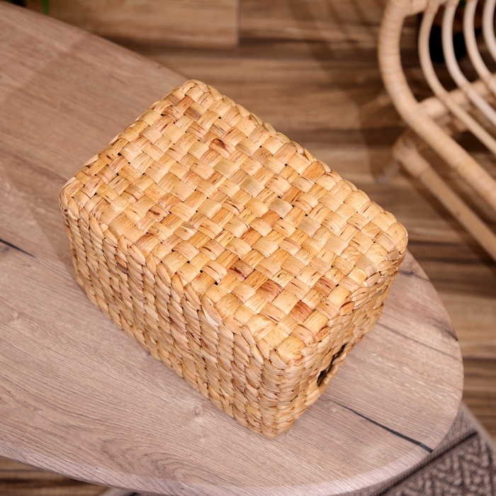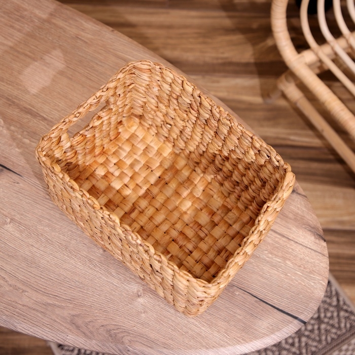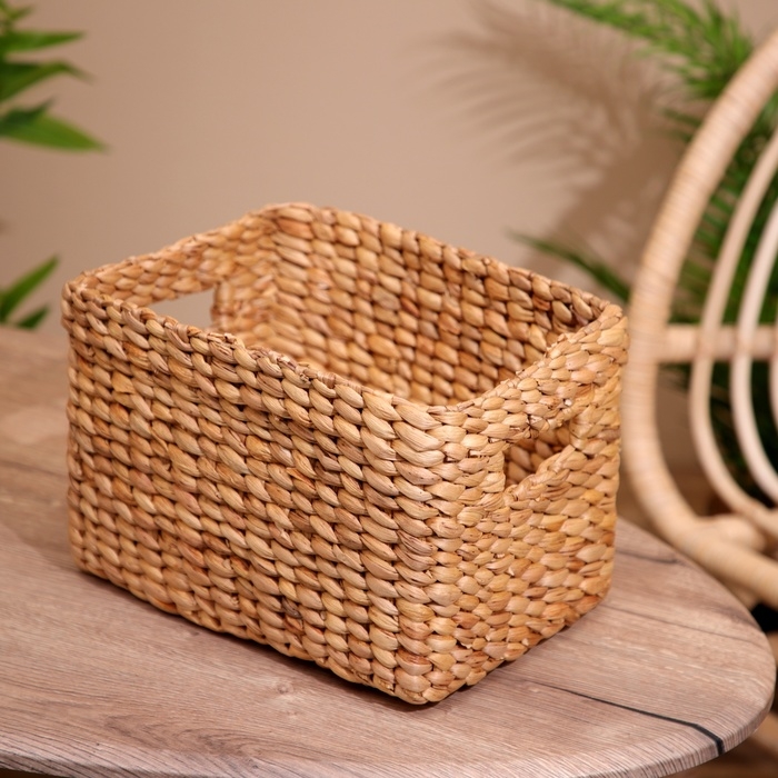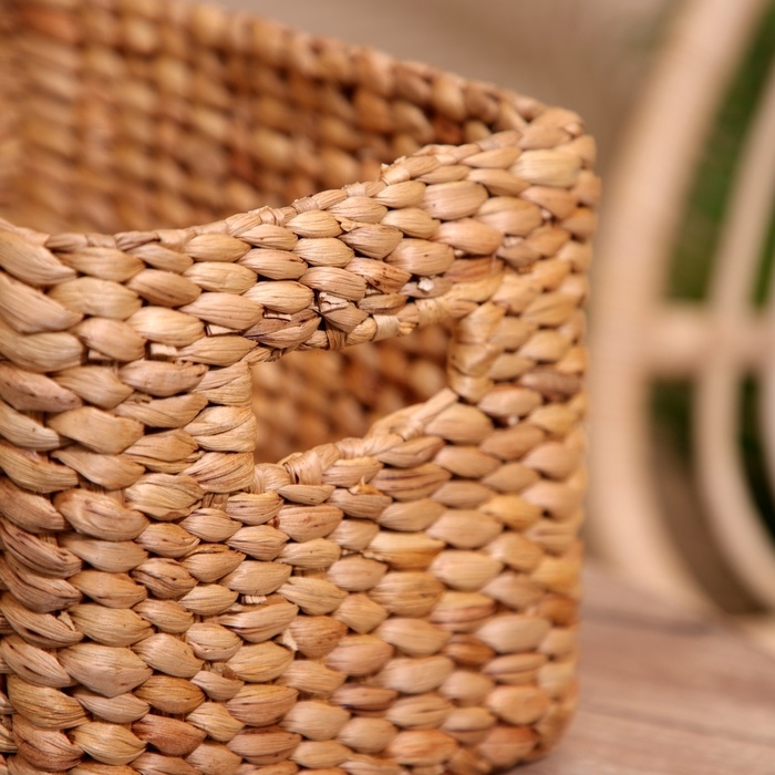 Плетёная корзинка ручной работы сделана из водного гиацинта. Поверхность обработана водоотталкивающим и антибактериальным покрытием, поэтому изделия можно использовать в ванных комнатах.