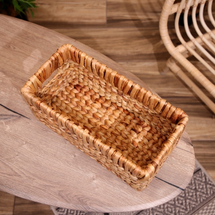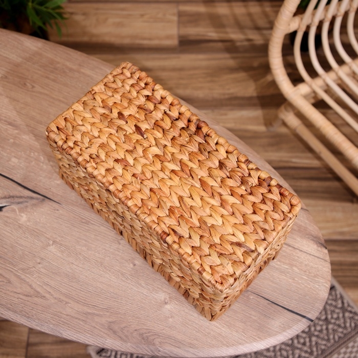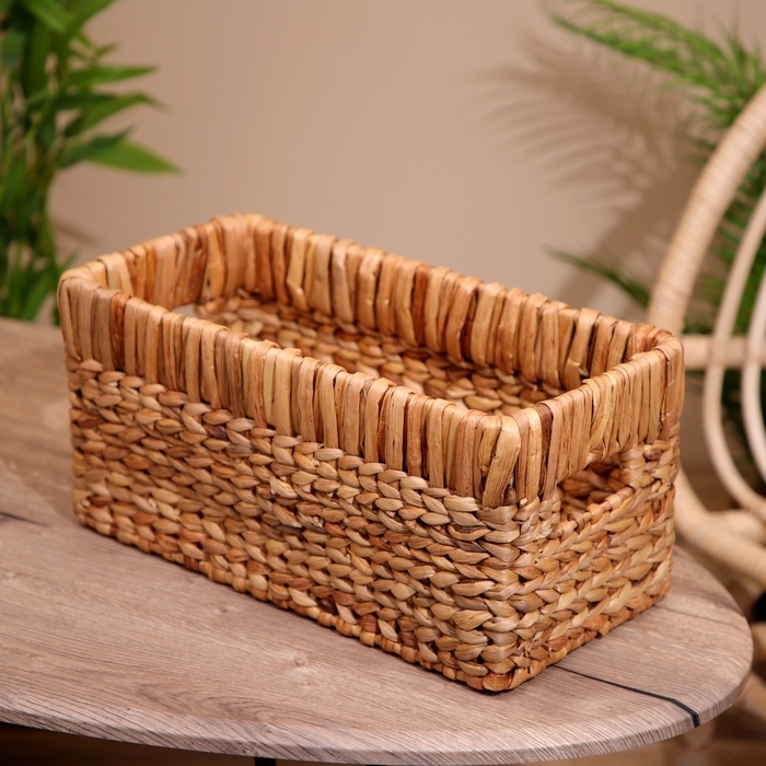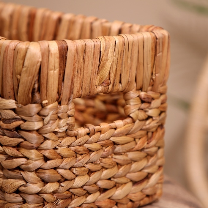 Плетёная корзинка ручной работы сделана из водного гиацинта. Поверхность обработана водоотталкивающим и антибактериальным покрытием, поэтому изделия можно использовать в ванных комнатах.
