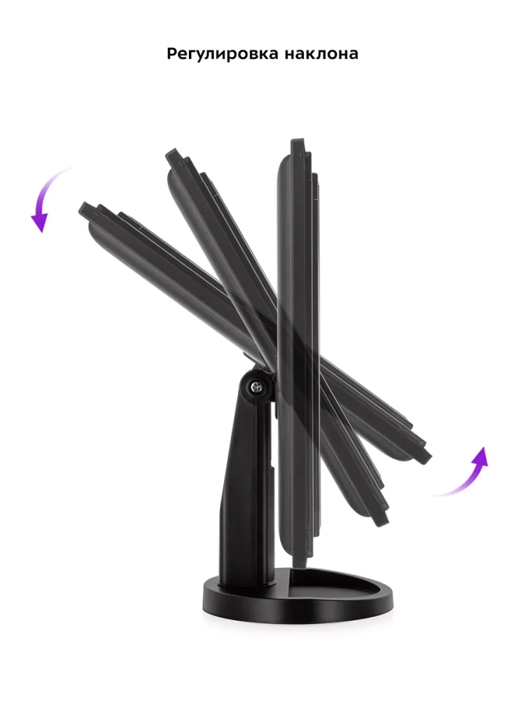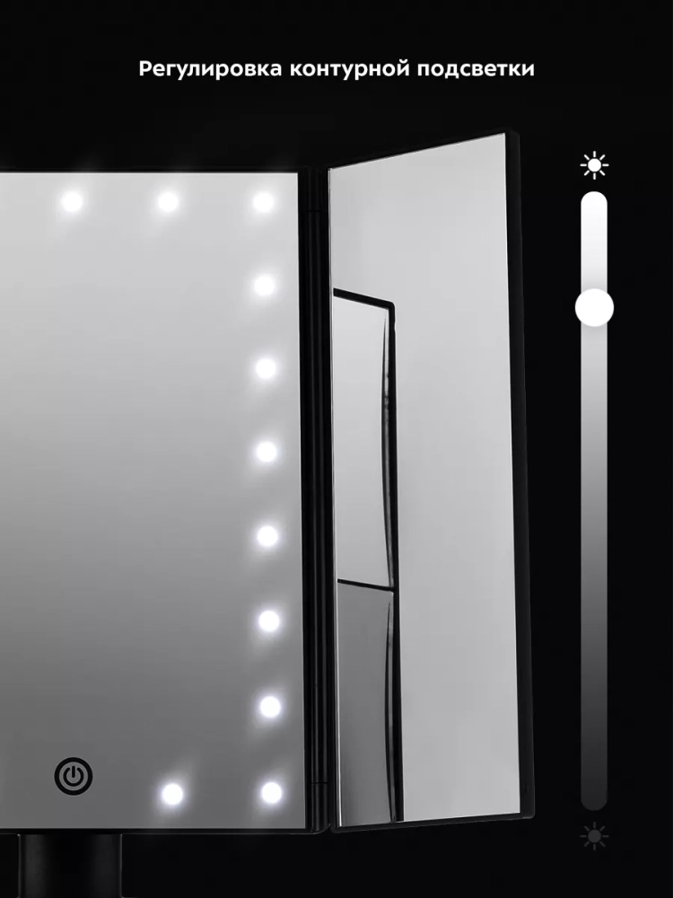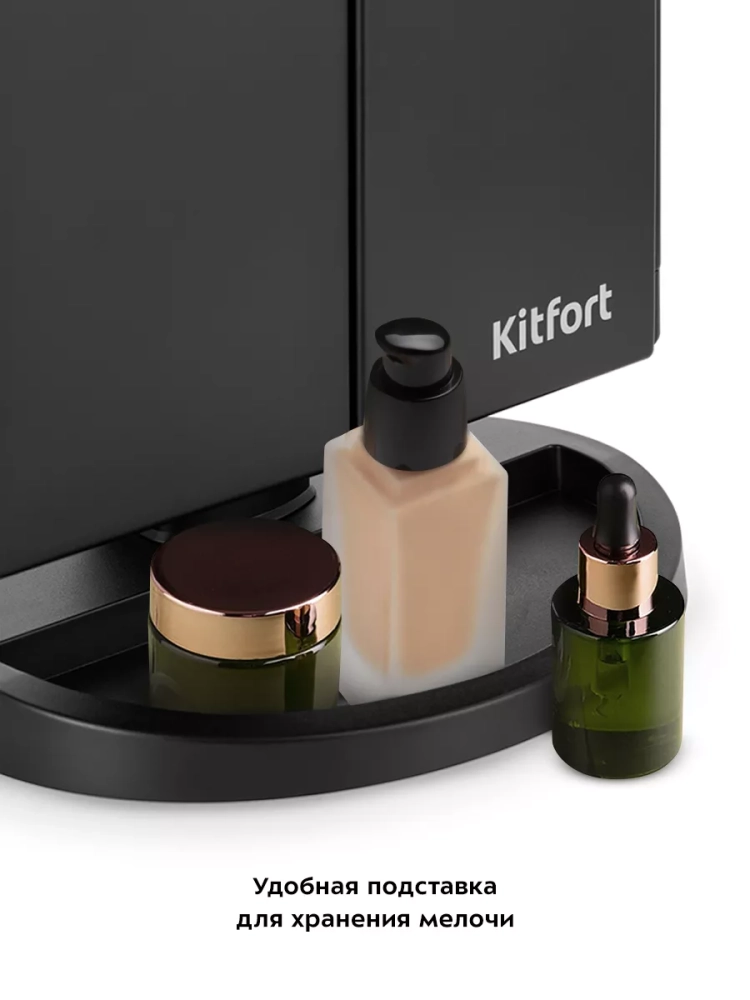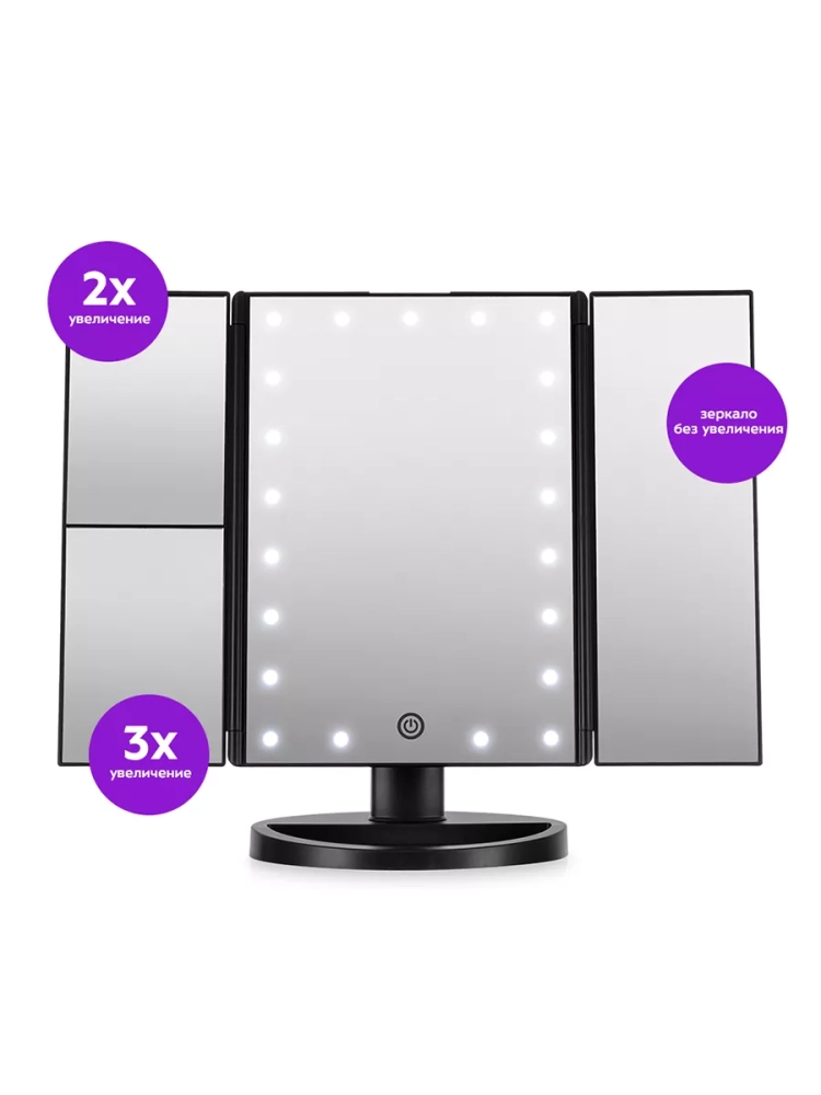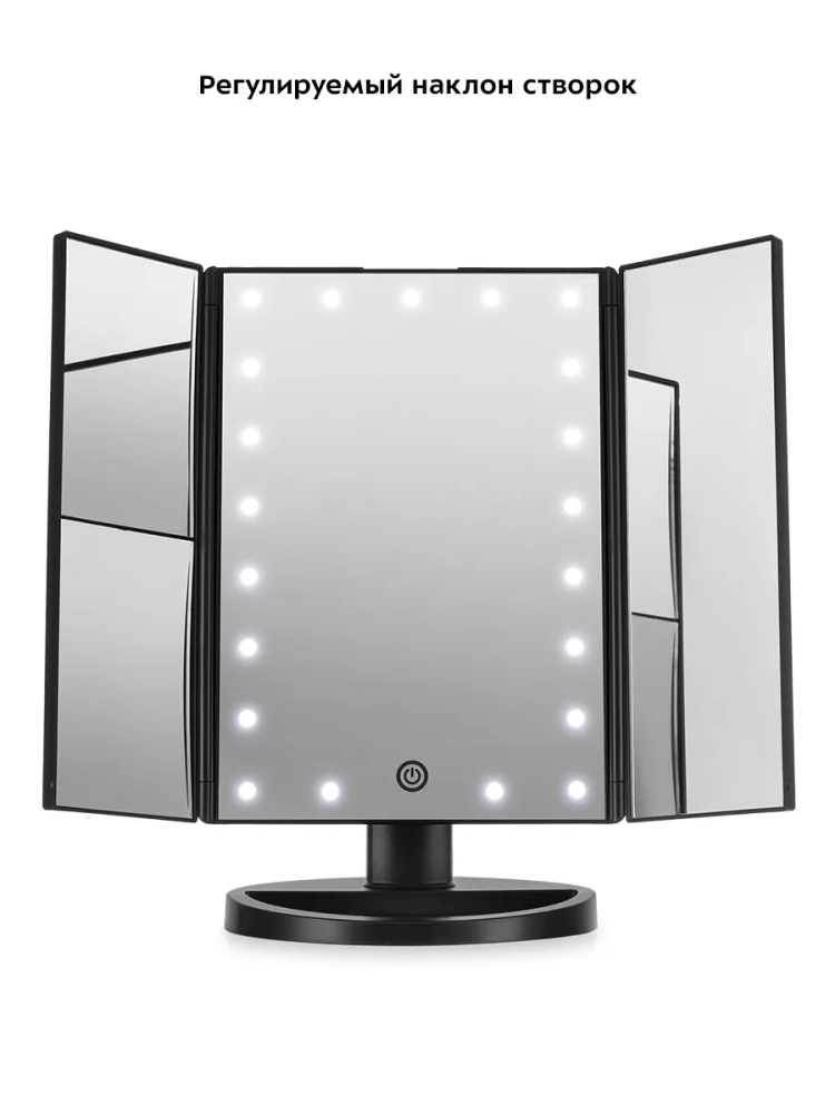 С косметическим зеркалом Kitfort KT-3171 нанесение макияжа и проведение косметических процедур станет удобнее. Зеркало устанавливается на стол, поэтому ваши руки останутся свободными и вам будет удобно наносить макияж. Зеркало состоит из центральной части и двух створок. В центральной части располагается большое зеркало без увеличения с подсветкой. В левой створке предусмотрены 2 зеркала: с двукратным и трехкратным увеличением. В правой створке расположено зеркало без увеличения. Благодаря наличию створок можно открыть их так, чтобы видеть себя с 3 сторон. Это может быть удобно, если вы делаете прическу. Также створки можно закрыть при хранении зеркала. Угол наклона регулируется. Контурная подсветка центрального зеркала поможет лучше разглядеть все мелкие детали даже в условиях недостаточного освещения в помещении. Подсветку можно отключить или настроить яркость. У подставки зеркала есть бортики, поэтому вы можете хранить на ней небольшие аксессуары или косметологические инструменты. Подсветка зеркала работает при подключении к источнику питания или от 4 батареек типа ААА. Это позволяет пользоваться зеркалом и включать подсветку в любом удобном месте. Мощность: 5 Вт / 6 Вт. Цветовая температура подсветки: 7000 ±500 К. Длина шнура Micro-USB: 1 м. Размер центрального зеркала без увеличения: 162 х 236 мм. Размер зеркала без увеличения: 78 х 236 мм. Размер зеркала с двукратным увеличением: 78 х 117 мм. Размер зеркала с трехкратным увеличением: 78 х 117 мм. Размер устройства: 180 х 120 x 280 мм