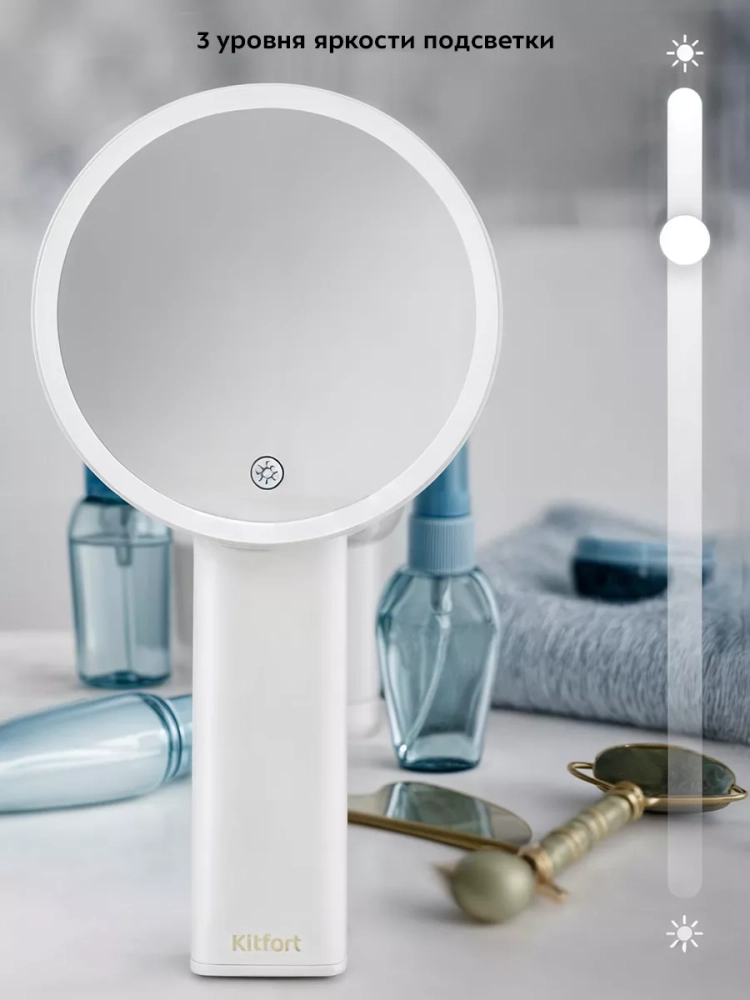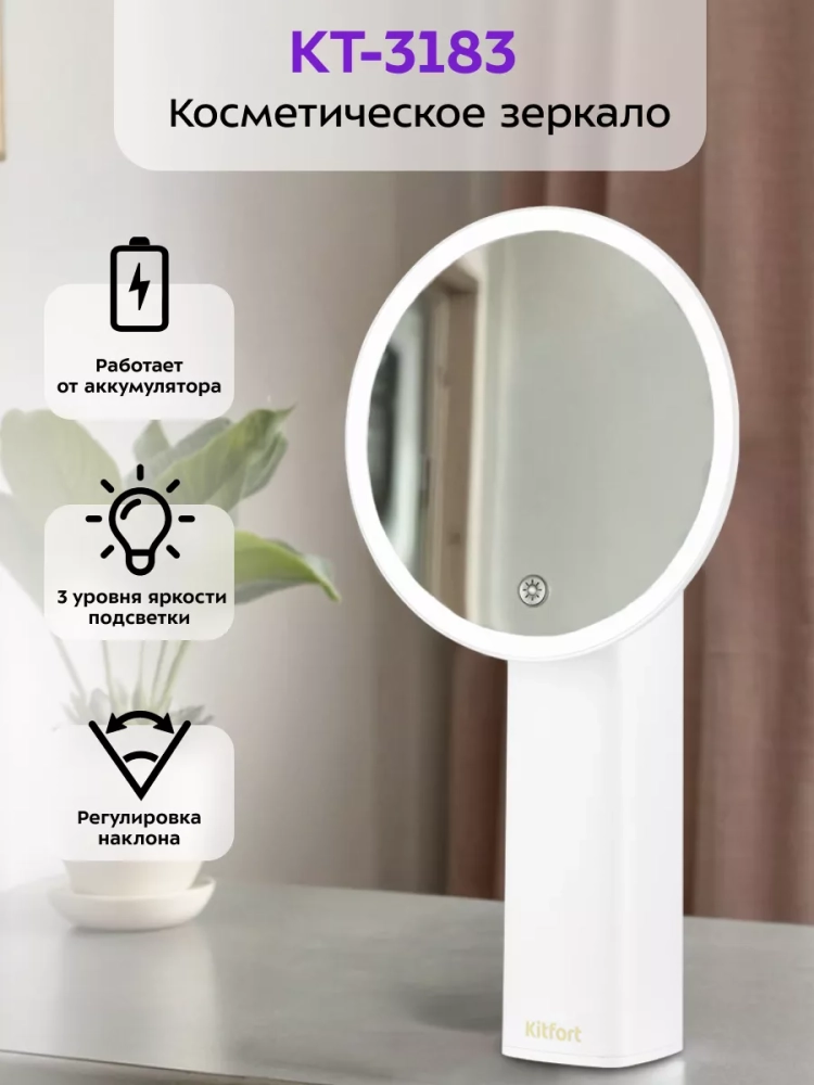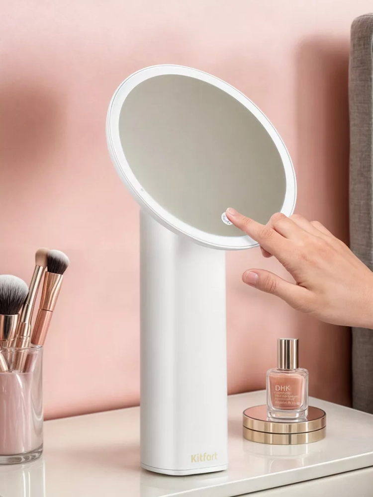 С косметическим зеркалом Kitfort KT-3183 нанесение макияжа и проведение косметических процедур станет удобнее. Зеркало устанавливается на стол, поэтому ваши руки остаются свободными и вам удобно наносить макияж. Угол наклона регулируется. Контурная подсветка зеркала поможет лучше разглядеть все мелкие детали даже в условиях недостаточного освещения в помещении. Подсветку можно отключить или настроить яркость.