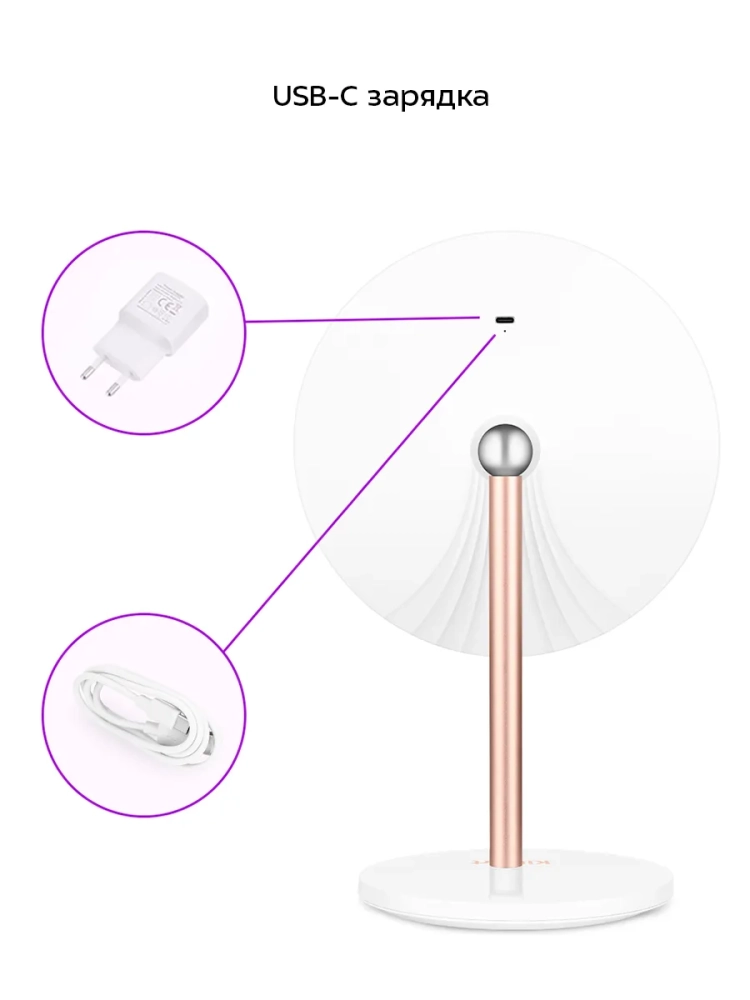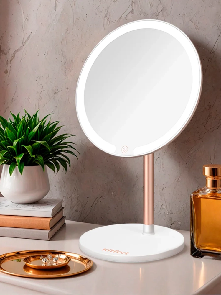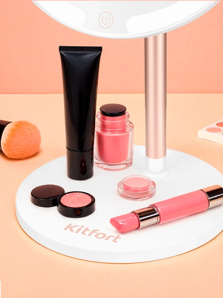 С косметическим зеркалом Kitfort KT-4127 нанесение макияжа и проведение косметических процедур станет удобнее. Зеркало устанавливается на подставку с магнитным держателем как на шарнир, благодаря этому вы можете поворачивать зеркало или регулировать угол наклона зеркальной поверхности. В комплекте также поставляется магнитный держатель для зеркала, который крепится на двусторонний скотч к гладкой поверхности. Так вы можете повесить зеркало на стену и не пользоваться подставкой зеркала. Зеркало легко снимается с подставки и магнитного держателя, поэтому при необходимости вы можете использовать зеркало, держа его в руках. Например, вы можете разглядеть прическу со всех сторон, стоя перед большим настенным зеркалом и держа в руках косметическое зеркало. Маленькое зеркало с 10-кратным увеличением, которое крепится на магниты на центральную часть основного зеркала, поможет разглядеть даже самые мелкие детали. Благодаря креплению маленького зеркала ваши руки останутся свободными, вам удобнее будет наносить макияж. Контурная подсветка зеркала поможет лучше разглядеть все мелкие детали даже в условиях недостаточного освещения в помещении. Яркость подсветки можно настроить, а также выбрать холодный, нейтральный или теплый свет. Подсветка зеркала работает от встроенного аккумулятора. Это позволяет пользоваться зеркалом и включать подсветку в любом удобном месте. Подставка зеркала по форме напоминает плоскую тарелку, поэтому вы можете хранить на ней небольшие аксессуары или косметологические инструменты. Питание: USB Type-C =5 В, 2 А. Мощность: 5 Вт. Аккумулятор: Li-Ion 3,7 В, 2 А*ч (7, 4 Вт*ч). Класс защиты от поражения электрическим током: III. Цветовая температура подсветки: холодный свет: 6000 К. нейтральный свет: 4000 К. теплый свет: 3000 К. Время зарядки: 3 ч. Время работы: 5 ч. Диаметр зеркала: 175 мм. Диаметр зеркала с увеличением: 85 мм. Длина шнура USB Type-C: 0,7 м. Размер устройства: 200 х 150 x 320 мм.