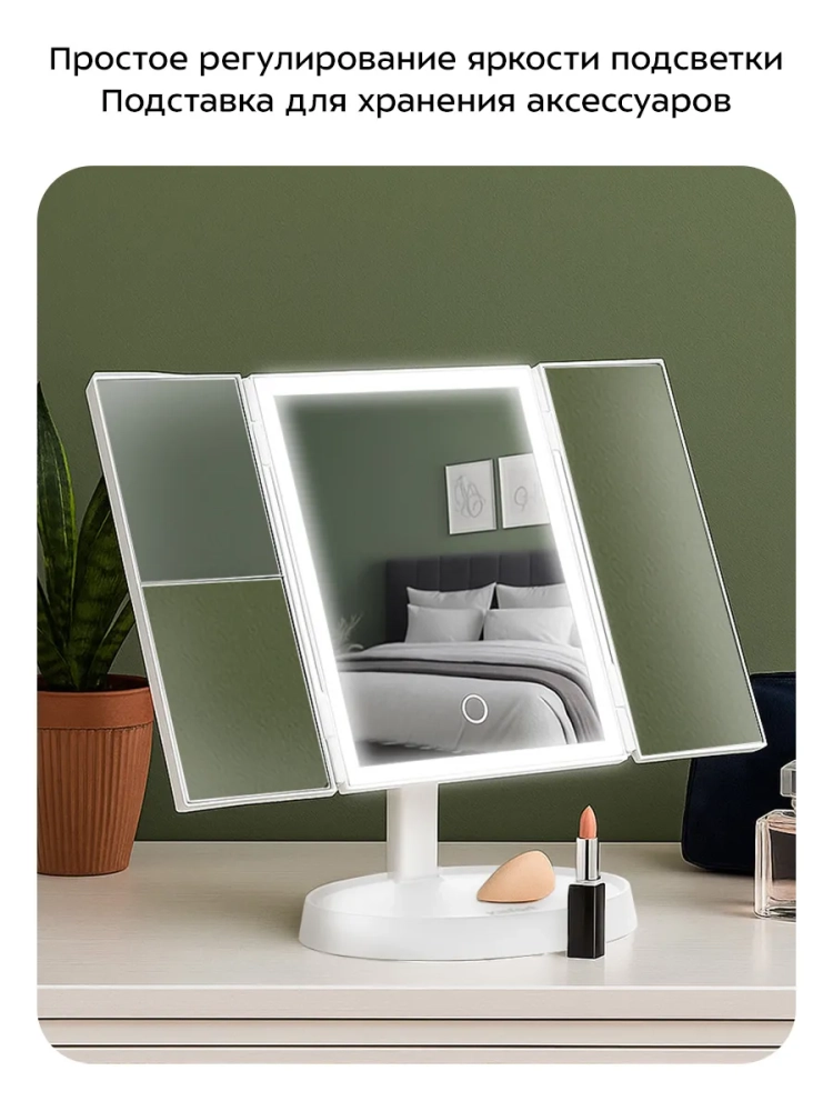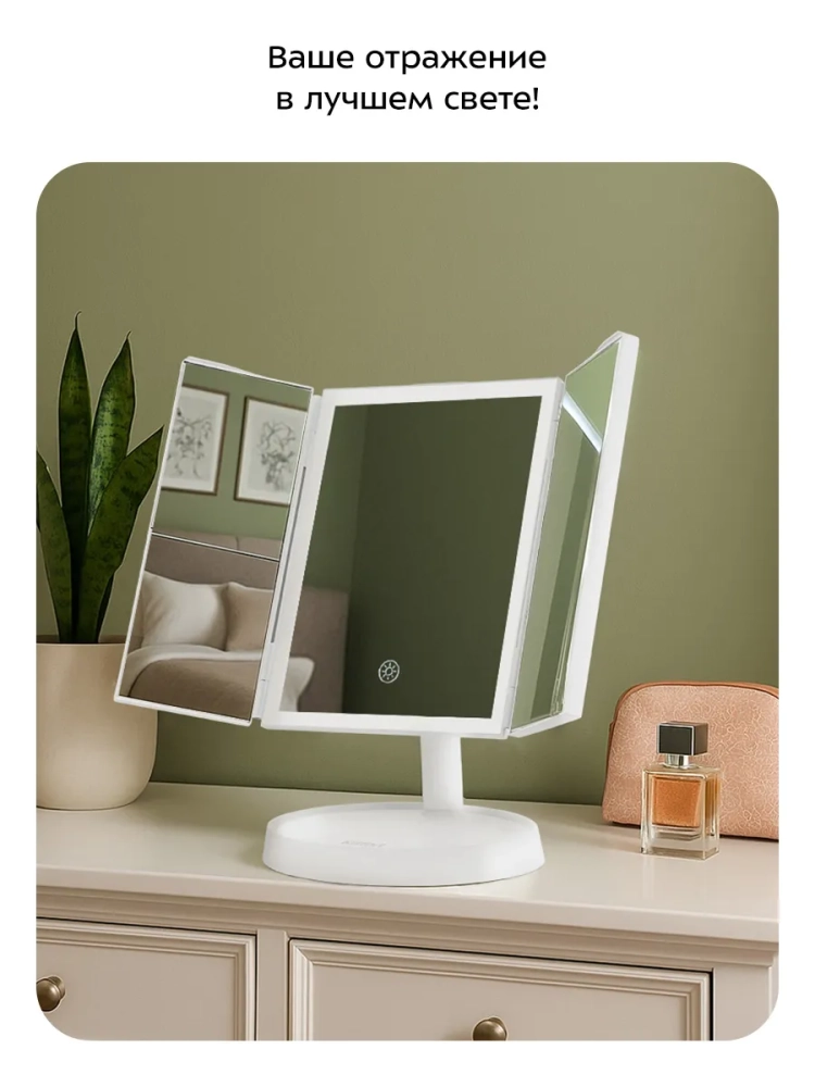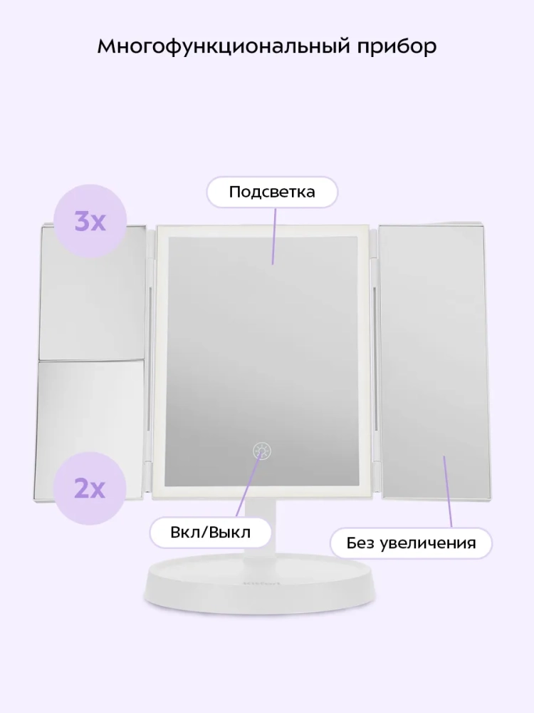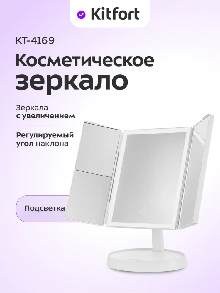 С косметическим зеркалом Kitfort KT-4169 нанесение макияжа и проведение косметических процедур станут удобнее. Зеркало устанавливается на стол, поэтому ваши руки останутся свободными и вам будет удобно наносить макияж. Зеркало состоит из центральной части и двух створок. В центральной части располагается большое зеркало без увеличения с подсветкой. В левой створке предусмотрены 2 зеркала, с двукратным и трехкратным увеличением. В правой створке расположено зеркало без увеличения. Благодаря наличию створок можно открыть их так, чтобы видеть себя с 3 сторон. Это может быть удобно, если вы делаете прическу. Створки можно закрыть при хранении зеркала. Угол наклона регулируется. Контурная подсветка центрального зеркала поможет лучше разглядеть все мелкие детали даже в условиях недостаточного освещения в помещении. Подсветку можно отключить или настроить ее яркость.