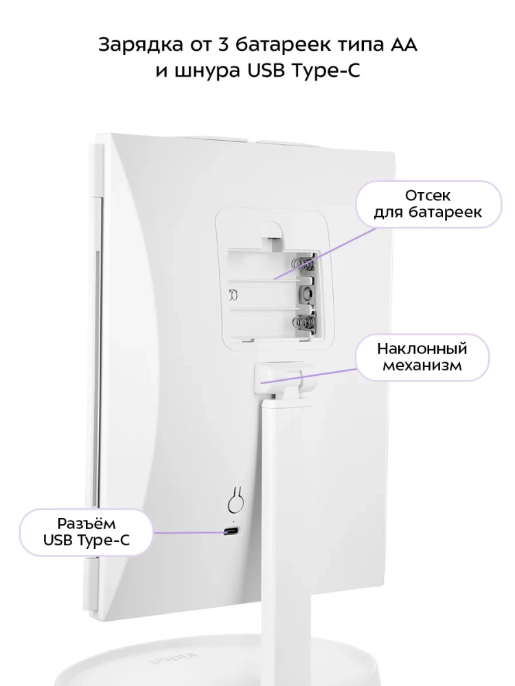 Подсветка зеркала работает при подключении к источнику питания или от 3 батареек типа АА. Это позволяет пользоваться зеркалом и включать подсветку в любом удобном месте.