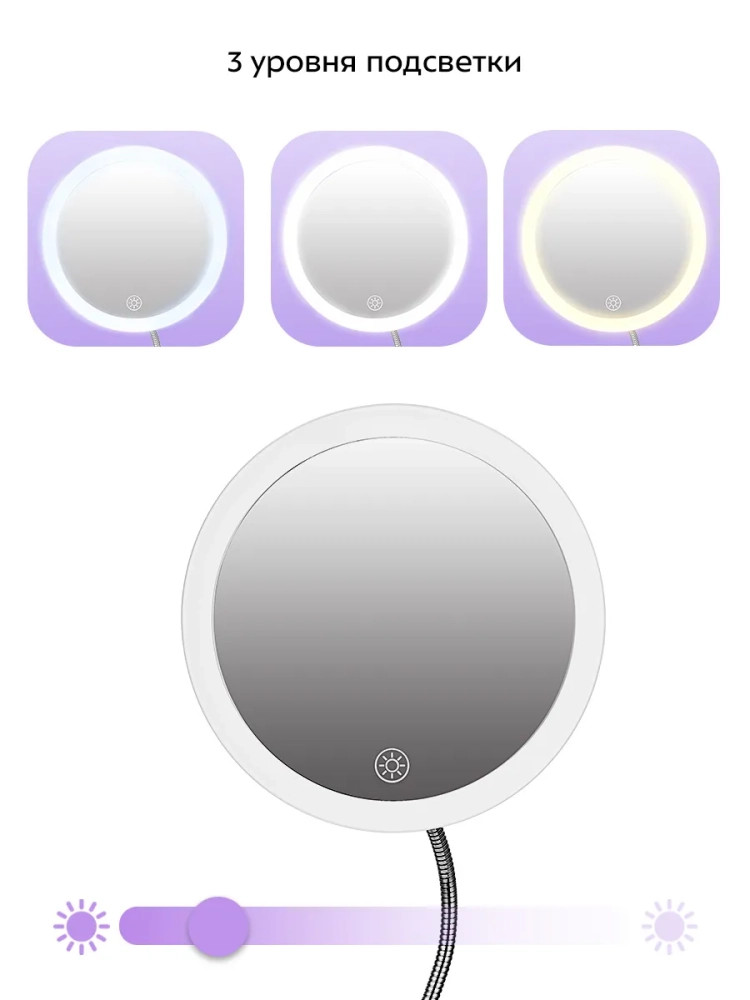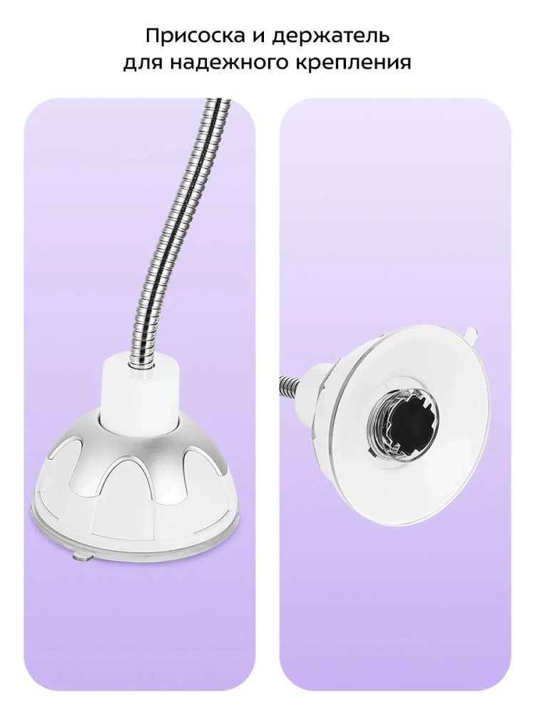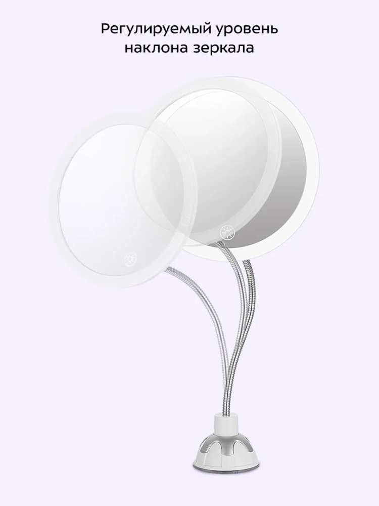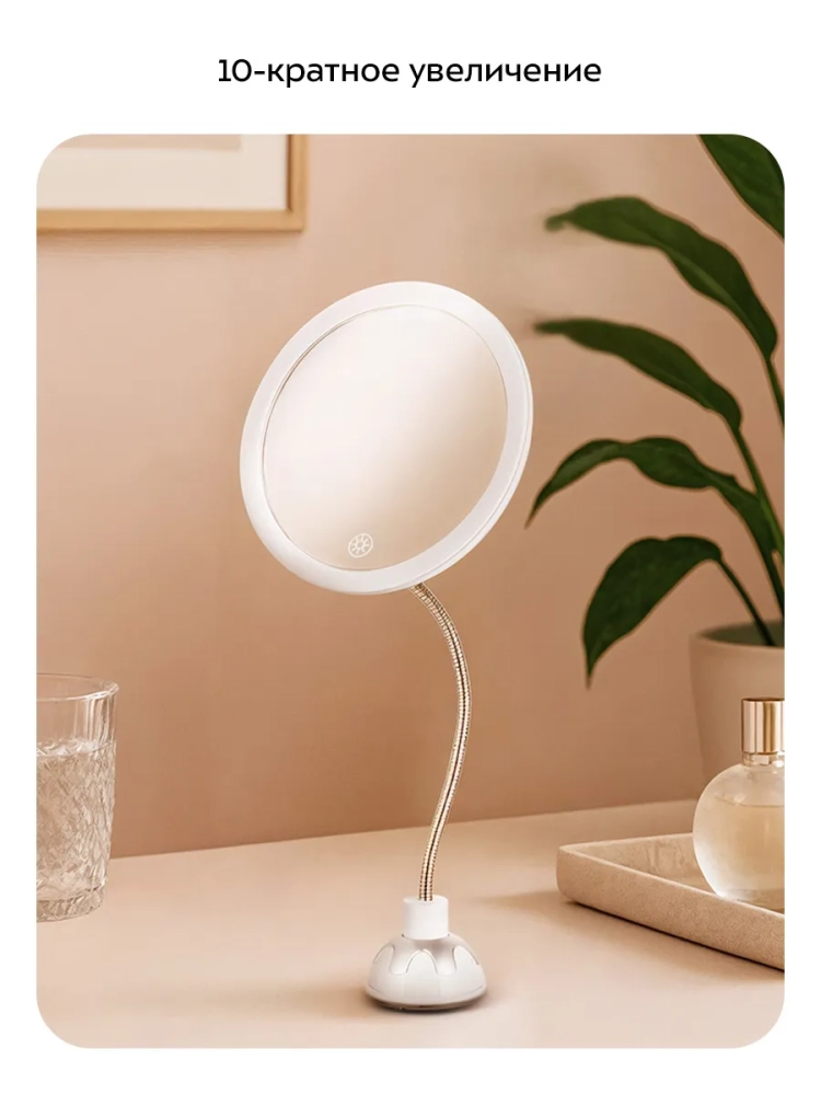 Зеркало крепится к горизонтальной или вертикальной гладкой поверхности на вакуумную присоску. Это очень удобно, так как вы можете расположить зеркало не только на столе, но и прикрепить к стене в любом удобном месте. Также ваши руки останутся свободными и вам будет удобно наносить макияж. Длинная гибкая ножка позволяет придвинуть или отодвинуть зеркало от себя, а также менять положение зеркала при необходимости.