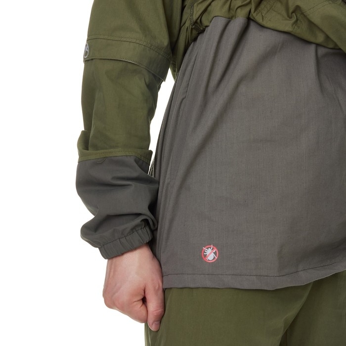 Костюм «Элит-Барьер» разработан на основе классического противоэнцефалитного костюма, который состоит из куртки типа «анорак» с капюшоном и брюк прямого кроя. Костюм оснащен специальными ловушками для клещей, внутри куртки предусмотрен дополнительный слой хлопковой трикотажной ткани, которая заправляется в брюки для максимальной защиты от проникновения внутрь изделия. Рукава оснащены плотными трикотажными манжетами. На капюшоне предусмотрена молния для противомоскитной сетки, которая компактно укладывается в карман на груди. В передней части куртки предусмотрен объемный передний влагозащитный карман и два боковых. Этот костюм отлично подойдет для всех, кто часто и долго бывает в лесу. Для обеспечения безопасности в темное время суток вся печать на изделии является светоотражающей.