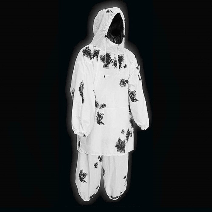 Зимний маскировочный костюм "Метель" для зимней охоты, одевается поверх зимней утепленной одежды. Предназначен для маскировки в зимнем лесу, на заснеженном поле. В нем вы не будете цепляться за ветки деревьев. Изготовлен из ацетатного шелка -позволяет охотнику полностью слиться с окружающей местностью. Цвет- белый клякса. Особенности модели: куртка "анорак" с молнией до середины груди, куртка имеет прорези для доступа в карманы зимней одежды. Капюшон стягивается шнуром с фиксатором, резинка по поясу и низу брюк.