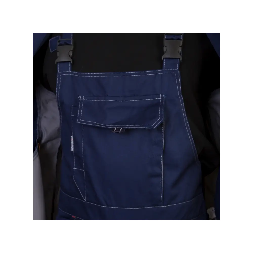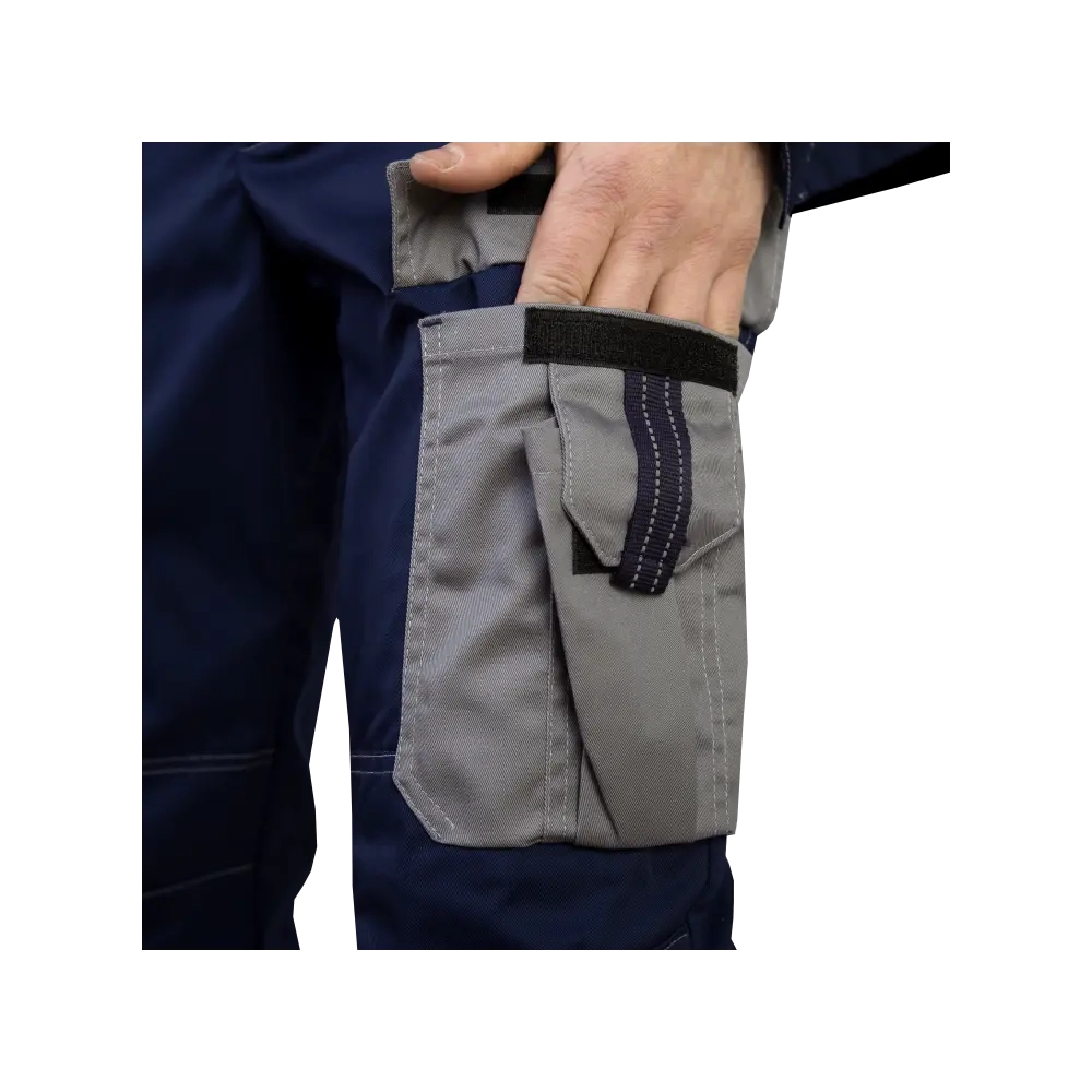 Костюм с 14 карманами состоит из куртки и полукомбинезона. Куртка прямого силуэта: - воротник - стойка, - центральная застежка-молния под планкой на липучках, - функциональные вместительные карманы спереди, - световозвращающие полосы на спинке и полочке, - кант из световозвращающего материала в рельефах переда, на кокетках спинки и полочки, - вентиляционные отверстия под кокеткой на спинке, - на рукавах манжеты с застёжкой на липучки, - регулировка низа куртки хлястиками на липучках, - спинка куртки удлиненная. Полукомбинезон: - регулируемые бретели со вставкой из резинки, - накладной карман с объёмом с левой стороны и отделением для ручки с правой, - на спинке в области пояса вставки из трикотажа, для удобной эксплуатации и регулирования объема по талии, - функциональные вместительные карманы для инструментов, - усилительные накладки в области колен, - карманы для амортизационных вкладышей на коленях, - канты из световозвращающего материала в рельефах и световозвращающие полосы.