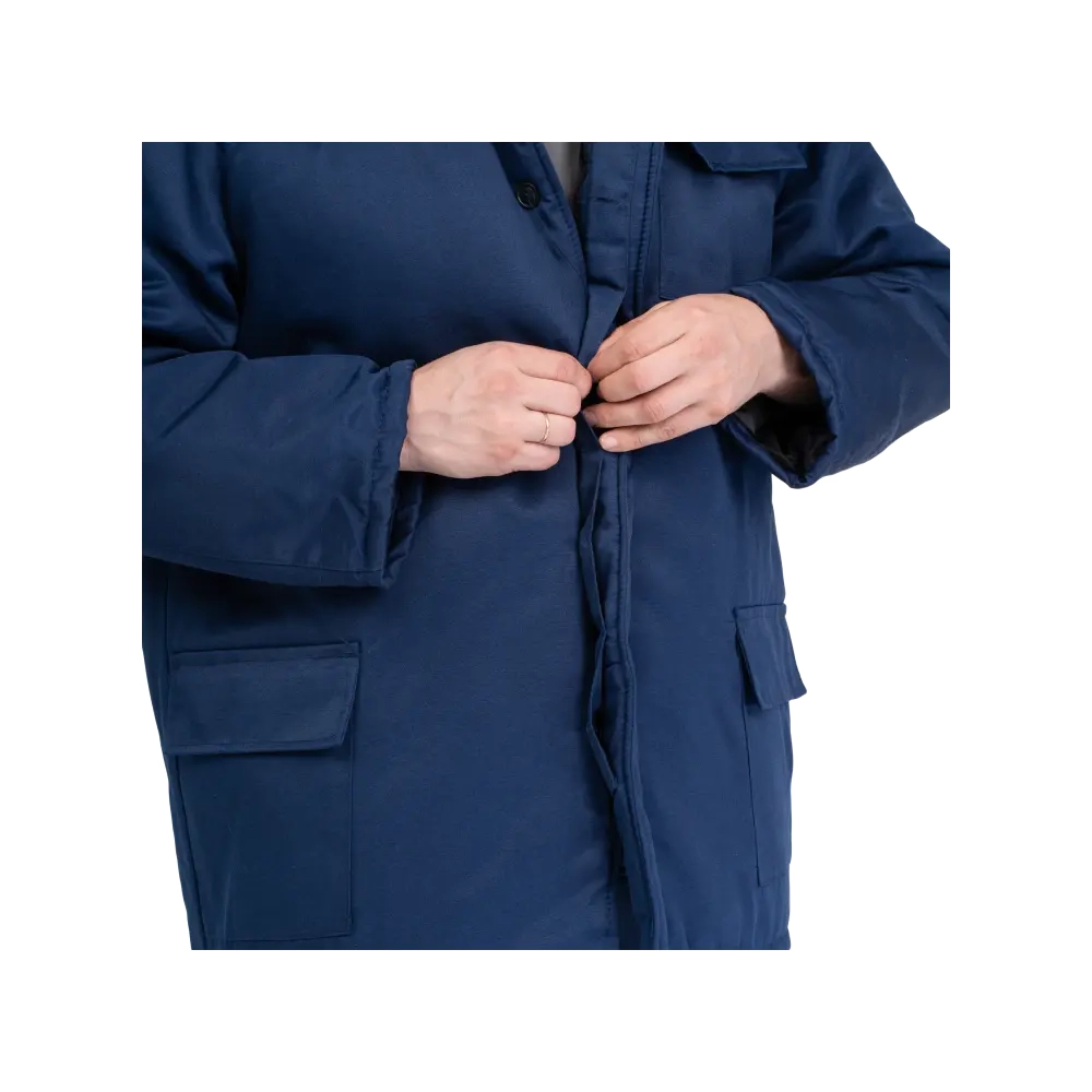 на пуговицах, утеплена двойным синтепоном. Есть три кармана