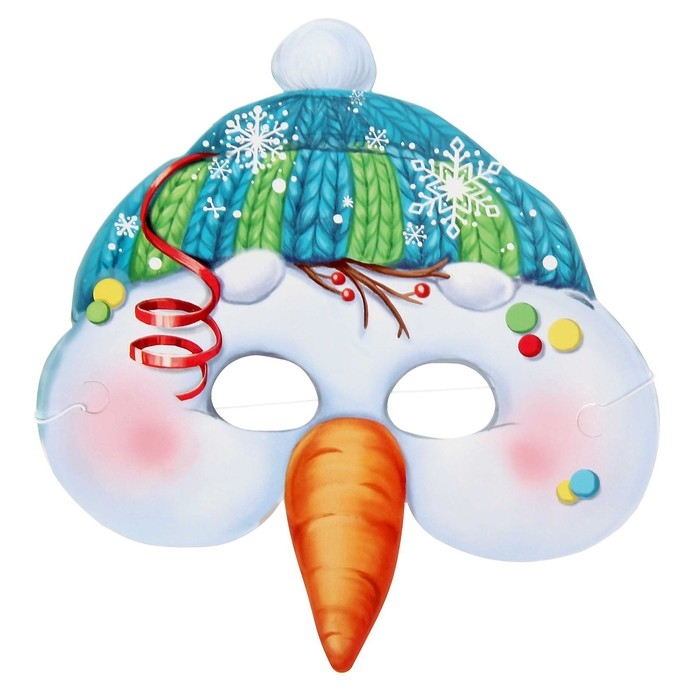 - Забавная маска с изображением веселого снеговика. Крепится на мягкую резинку, не причиняя дикомфорта ребенку.