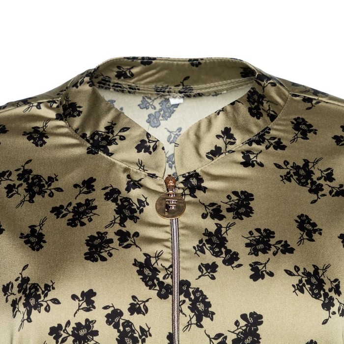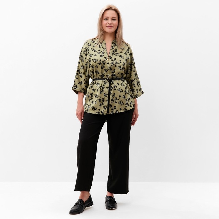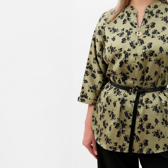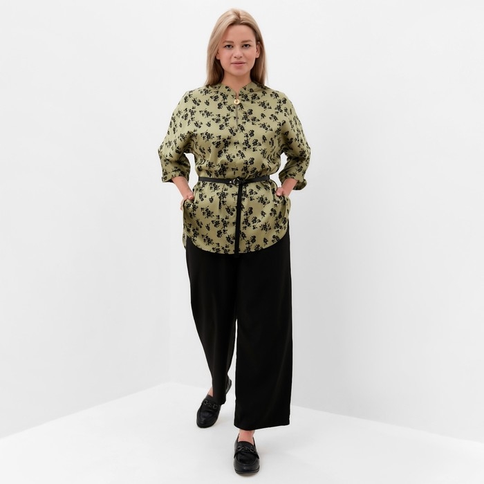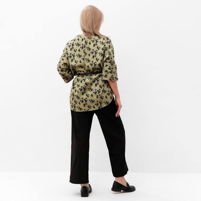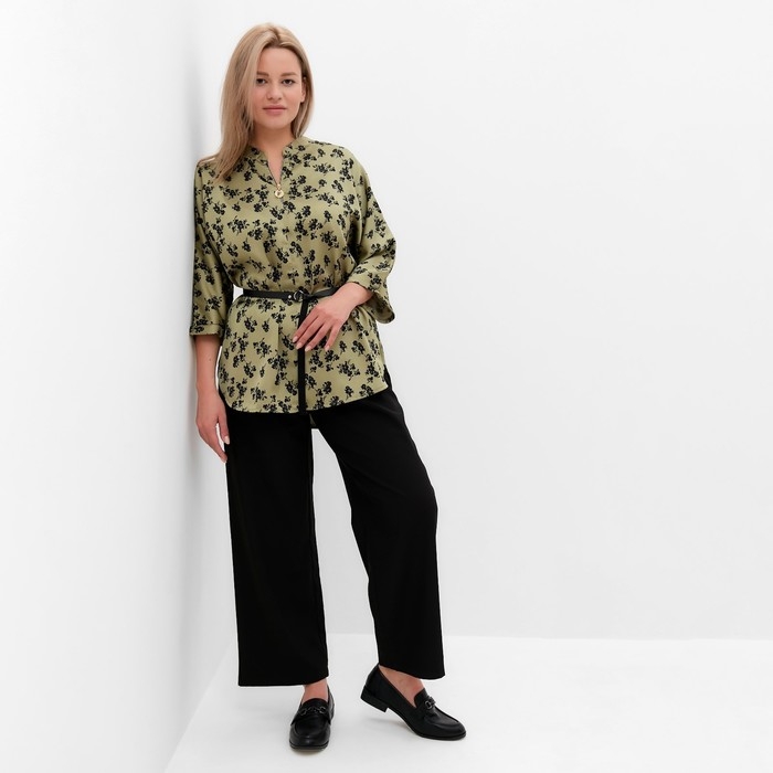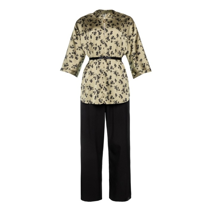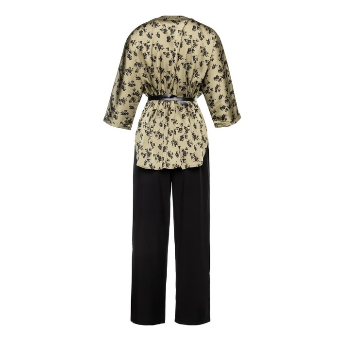 Костюм женский (туника и брюки), цвет хаки/черный, принт цветы, размер 56