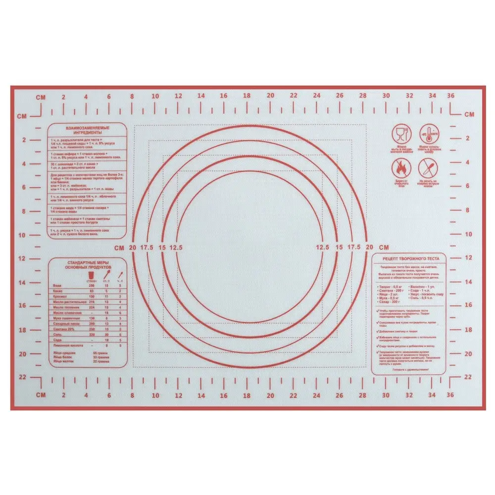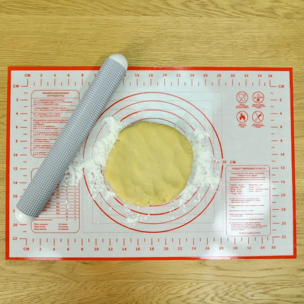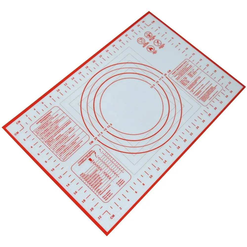 Коврик из силикона обладает антипригарными свойствами его можно использовать для приготовления пищи в духовом шкафу на противнях или в микроволновой печи (выдерживает температуру от -30 C до +220 градусов С), а также при хранении продуктов в морозильной камере. Удобно использовать коврик для раскатывания теста, а благодаря имеющейся разметке, вы сможете раскатать тесто в идеальный круг или порезать его на равные части. Для нарезки используйте пластиковый нож или кулинарный шпатель.