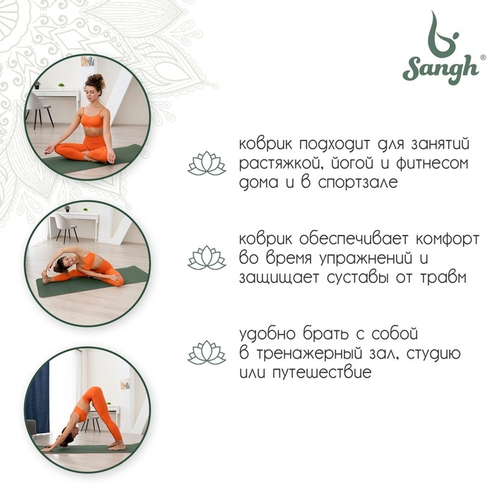 Коврик для йоги Sangh, 183×61×0,8 см, цвет тёмно-зелёный