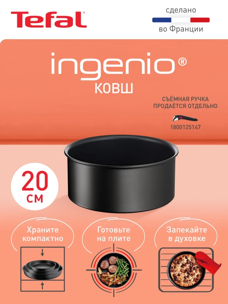 Алюминиевый ковш 20 см Tefal Ingenio Unlimited L7633032 со съемной ручкой сделает процесс приготовления пищи дома максимально легким и удобным.
