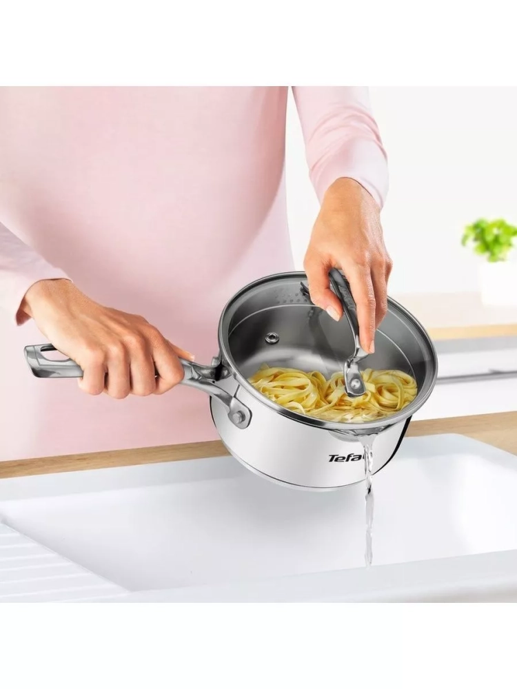 Посуда для кухни выполнена из нержавеющей стали премиального качества, что гарантирует долгий срок службы и устойчивость к повреждениям даже при ежедневном использовании. В комплекте с маленьким сотейником Тефаль есть стеклянная крышка с отверстиями для удобного слива жидкости, что позволяет обойтись без использования дуршлага. Продуманная мерная шкала на внутренней стенке кухонного инвентаря помогает точно отмерить объем необходимых ингредиентов. Также кухонный ковш с носиком оснащен прочной ручкой с заклепочным креплением, которая обеспечивает безопасное и комфортное использование.
