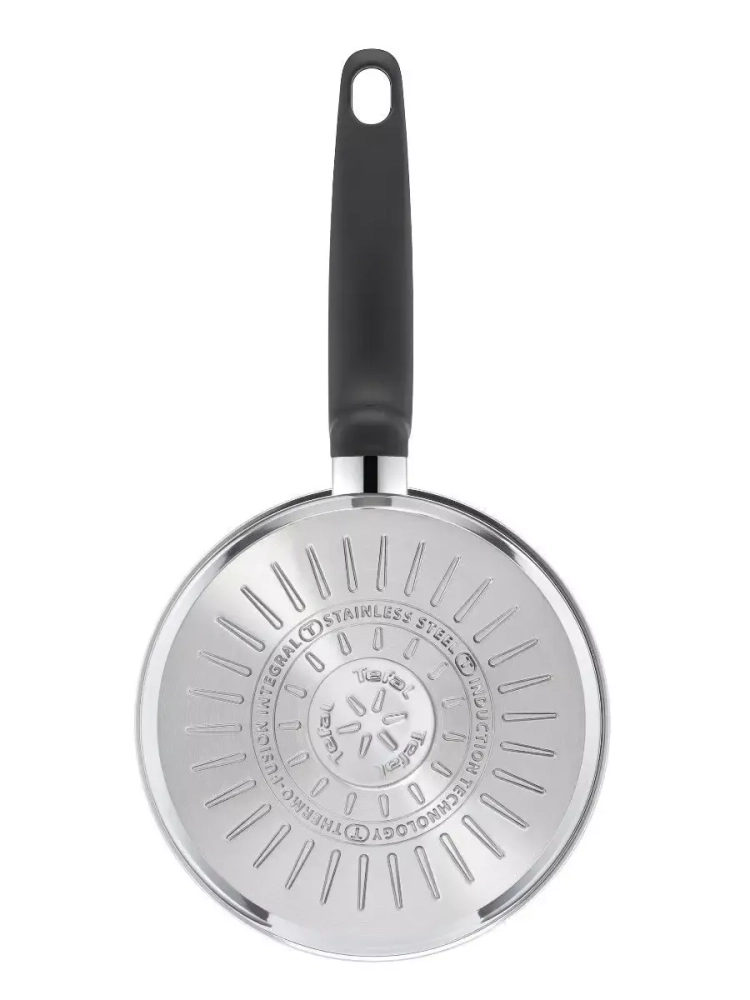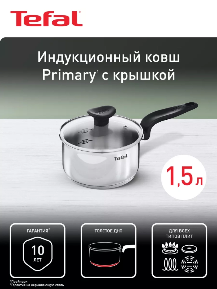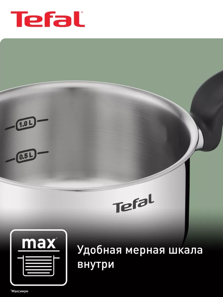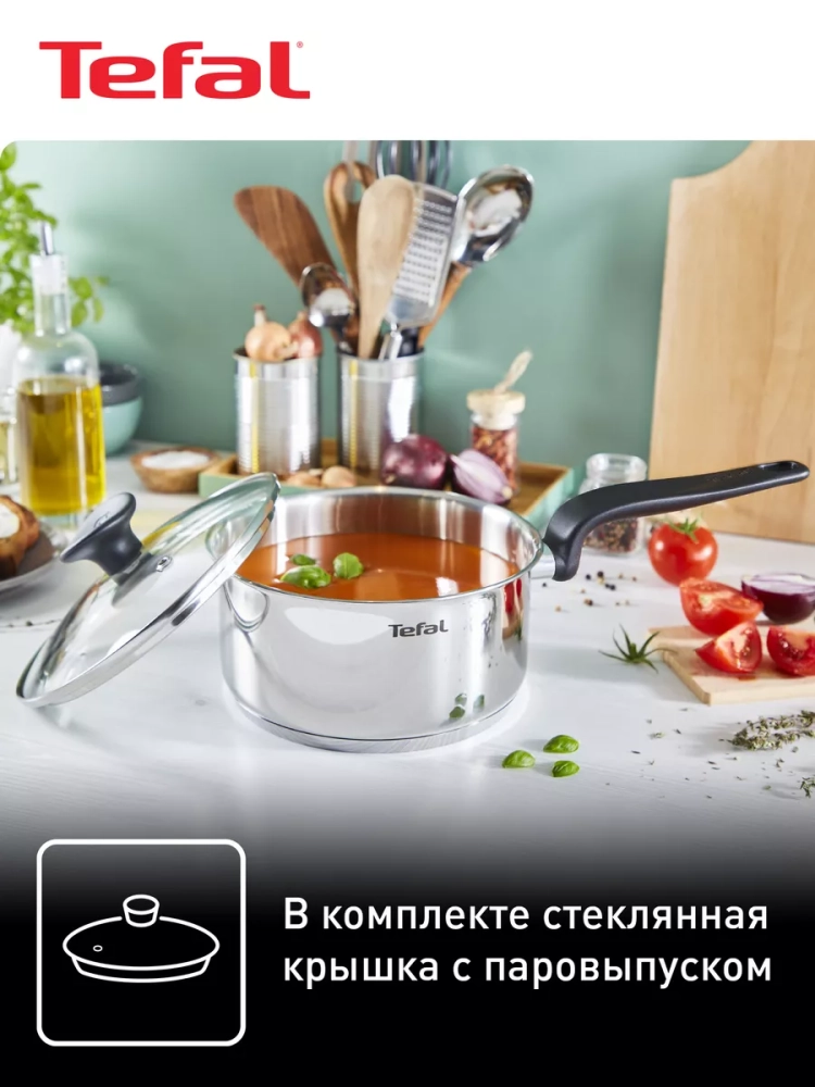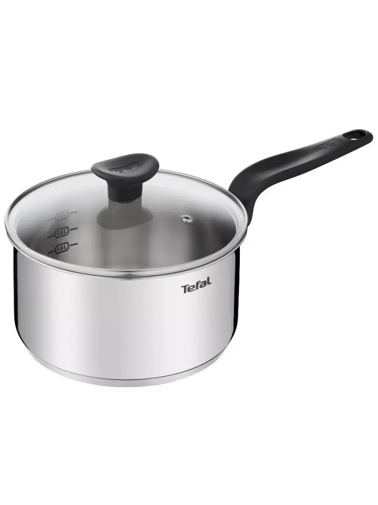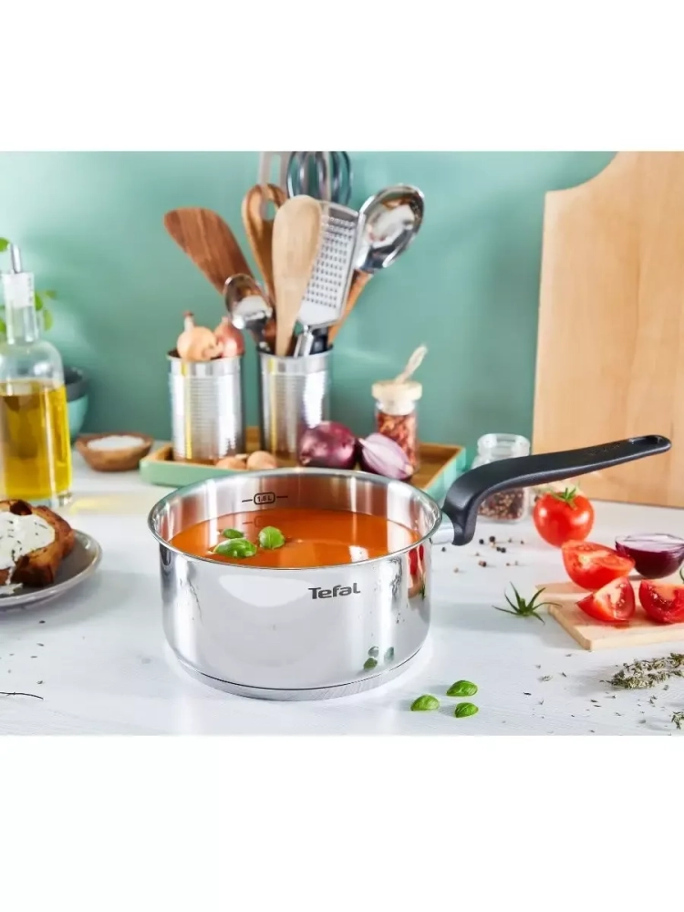 Посуда для кухни выполнена из высококачественной нержавеющей стали с толстым индукционным дном, что гарантирует равномерное распределение тепла и долговечность использования. Точная мерная шкала на внутренней поверхности стенки сотейника позволяет удобно измерять жидкие ингредиенты и объем готовой пищи. Стеклянная крышка с отверстием для выпуска пара помогает контролировать процесс готовки, сохраняя сочность и аромат блюд. Кроме того, маленькая кастрюля Тефаль оснащен эргономичной ручкой, которая не нагревается, обеспечивая безопасность и комфорт во время приготовления еды. Кухонный металлический ковш объемом 1,5 л подходит для всех типов плит, включая индукционные, а также изделие можно мыть в посудомоечной машине.
