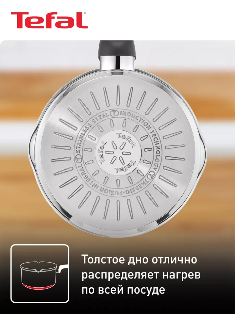 Готовьте так, как вы любите, и будьте спокойны за свою посуду с 10-летней гарантией производителя на качественную нержавеющую сталь и усовершенствованные технологии производства, которые гарантируют максимальную прочность, устойчивость к повреждениям, долговечность и удовольствие от использования. Толстое инкапсулированное дно посуды для кухни отлично распределяет тепло и обеспечивает равномерное приготовление пищи. Кроме того, сотейник оснащен инновационной системой блокировки для более легкого и комфортного слива лишней жидкости без использования дуршлага. Просто заблокируйте стеклянную крышку так, чтобы отверстия совпадали с носиками на кастрюле, и наклоните ее, чтобы слить воду. Ручка металлического ковша и крышки выполнены из бакелита и имеют нескользящее покрытие, которое выполняет функцию держателя для половника, позволяя сохранять рабочую поверхность чистой. Мерная шкала на внутренней стенке посуды для дома помогает точно отмерять количество жидких ингредиентов и объем готовых блюд. Кастрюля Тефаль совместима со всеми типами плит, включая индукционные, и подходит для мытья в посудомоечной машине, что делает её использование максимально удобным.