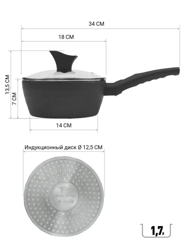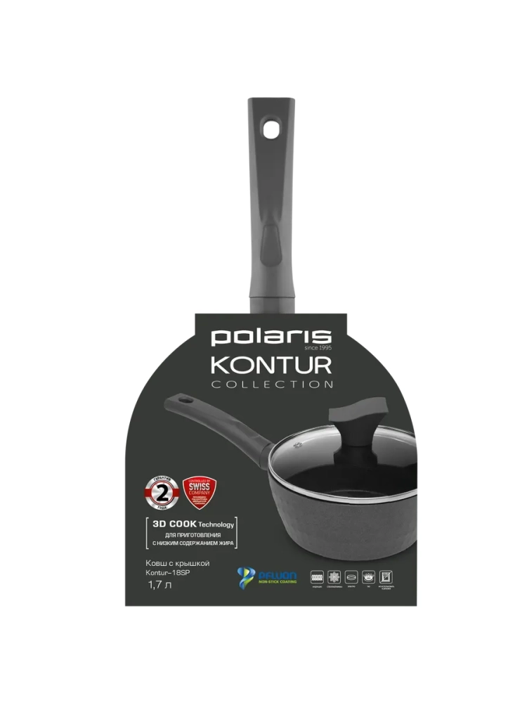 Ковшик кухонный со стеклянной крышкой Kontur-18SP - это приготовление вкусных блюд, сопровождение прекрасного настроения. Готовите ли вы ужин, завтрак, обед на двоих или для большой семьи, вам понадобятся правильные кастрюли, чтобы подготовиться должным образом к гостям. С нашими ковшами разного литража, - от маленького на 1,1 литра до большого на 1,7 литров, вы сможете потушить, пожарить овощи, разогреть или приготовить каши, детское питание или отварить гарнир: макароны, картофельное пюре, густой пряный соус и даже приготовить десерт, а также может использоваться для молока и для плавления шоколада. Весь товар Polaris разрабатывается совместно с европейскими инженерами и соответствует европейским сертификатам качества. Наша цель состоит в том, чтобы создавать на рынке продукты, которые значительно улучшают жизнь и здоровье. Мы позаботились о вашем здоровом питании, поэтому используем только качественные и безопасные материалы на которые даем вам гарантию - 2 года. Наша кастрюля имеет термостойкую эргономичную длинную бакелитовую ручку с покрытием «Soft Touch», удобна для захвата и остается прохладной во время приготовления пищи. Корпус из кованого алюминия равномернее прогревается и дольше сохраняет тепло, чем посуда из штампованного алюминия. Обеспечивает быстрый нагрев и равномерное распределение тепла, и предотвращает появление точек на поверхности от перегрева. Термостойкое внутреннее внешнее покрытие. Инновационное антипригарное покрытие с керамической крошкой не содержит вредные для здоровья вещества PFOA и PFOS. Антипригарное покрытие DYFLON очень легко чистить - можно мыть в посудомоечной машине. Благодаря превосходным антипригарным свойствам нашей посуды и внутренней поверхности без заклепок, уход за изделием становится легкой задачей. Просто протрите тряпкой или промойте водой. Технология 3D COOK TECHNOLOGY – это рельефная внутренняя поверхность для приготовления с низком содержанием жира. Посуда ПОДХОДИТ ДЛЯ ВСЕХ ПЛИТ, ВКЛЮЧАЯ ИНДУКЦИОННЫЕ!