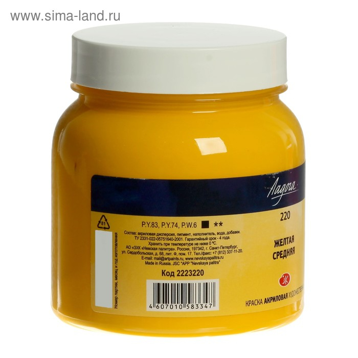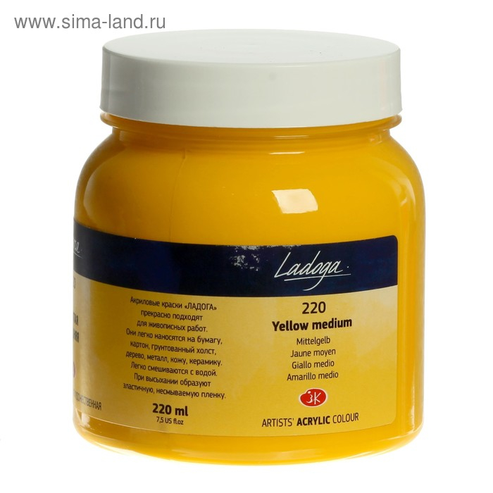 Краска акриловая художественная в банке 220 мл, ЗХК "Ладога", жёлтая средняя, 2223220