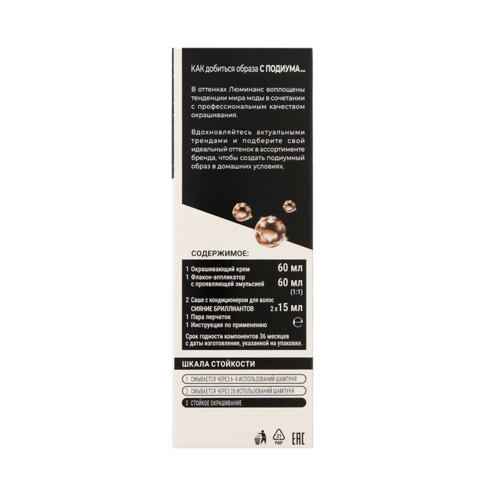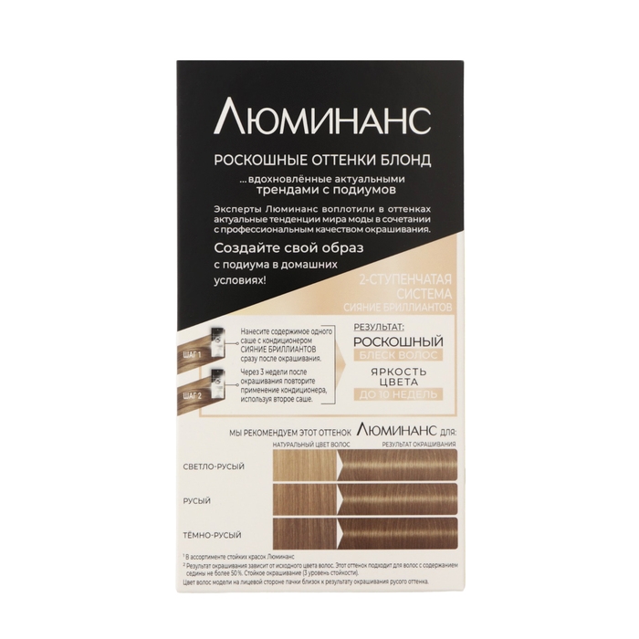 В оттенках стойкой краски для волос Люминанс воплощены последние тенденции мира моды и окрашивания в сочетании с профессиональным результатом. Формула с аммиаком и 2х-ступенчатой системой сияние бриллиантов позволяет добиться восхитительной яркости цвета до 10 недель и экстраблеска.