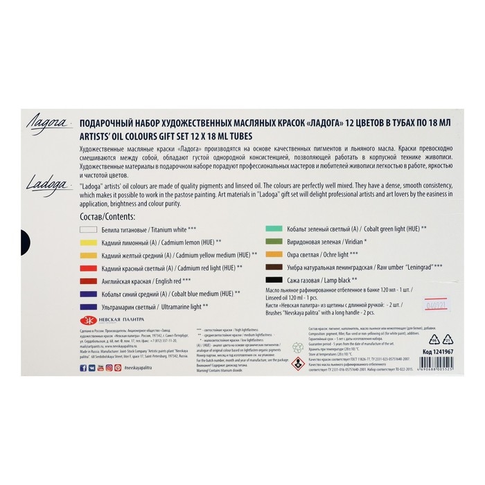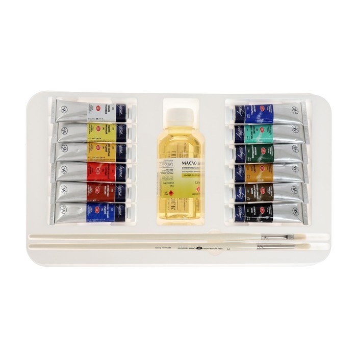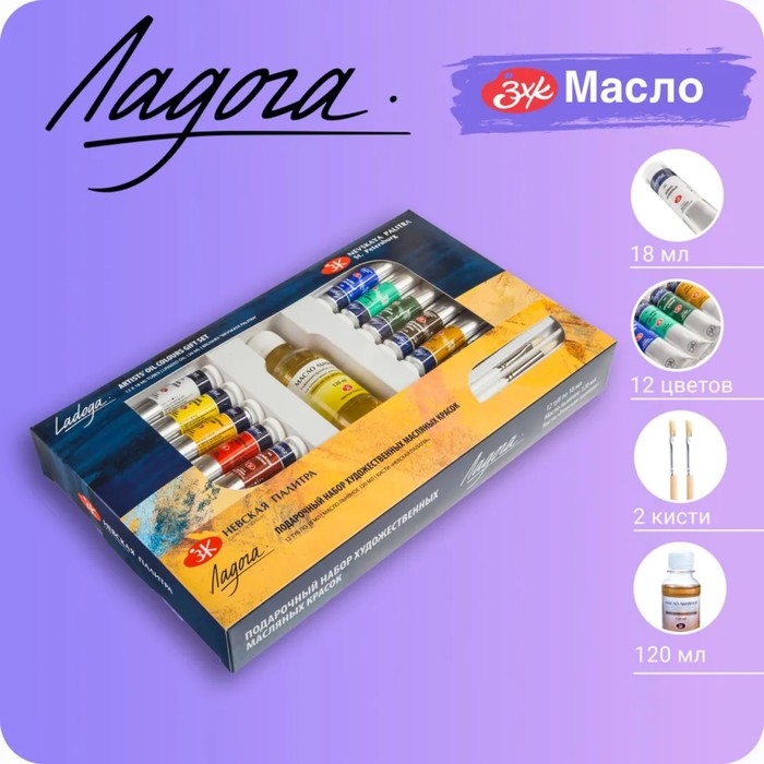 Краска масляная художественная, набор 12 цветов х 18 мл, ЗХК "Ладога" подарочный, кисти 2 штуки, масло льняное 120 мл, 1241967