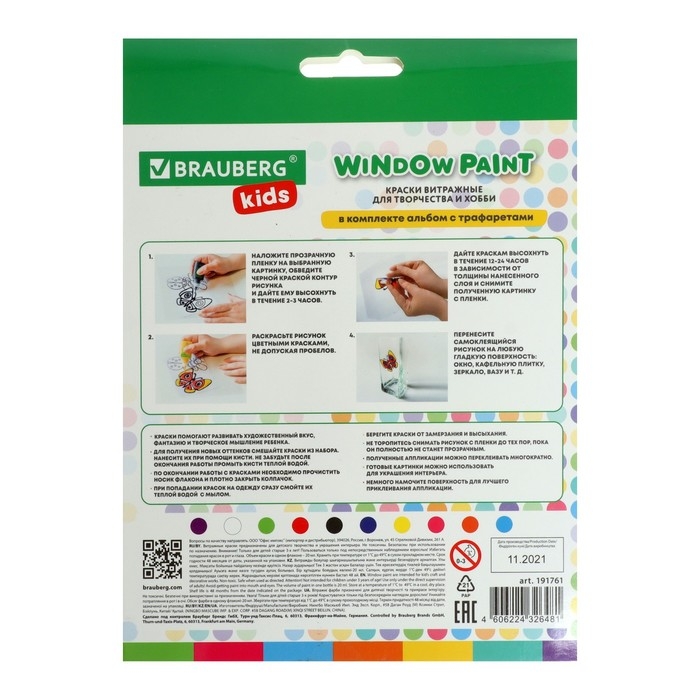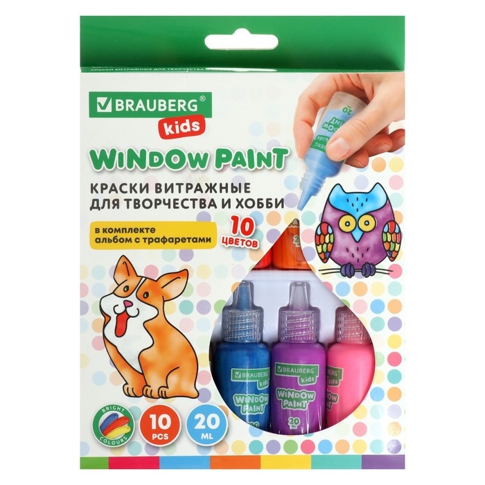 Краска по стеклу витражная Аппликация набор 10цв*20мл BRAUBERG KIDS, книга шаблонов, 191761