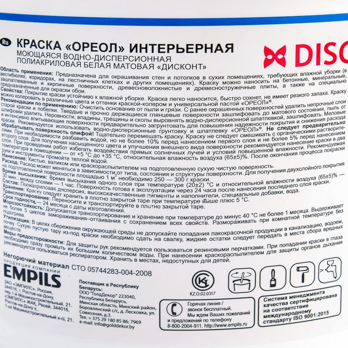 Краска водно-дисперсионная ОРЕОЛ Дисконт для внутренних работ моющаяся 3кг