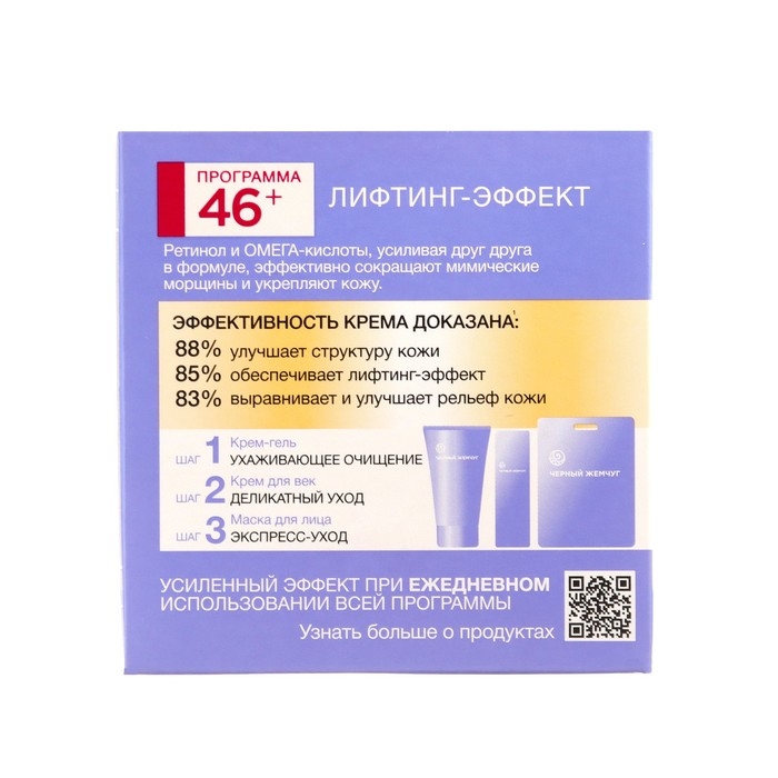 Программа красоты «Лифтинг-эффект» рекомендована к использованию от 46 лет: в этот период кожа становится более тонкой, закладываются глубокие морщины. Необходима направленная активизация выработки собственных омолаживающих веществ, укрепление барьерной функции кожи и мощная стимуляция разглаживания. В отличие от обычных омолаживающих средств, которые насыщают кожу извне, формулы кремов Чёрный жемчуг линейки «Самоомоложение» запускают в коже естественные процессы.