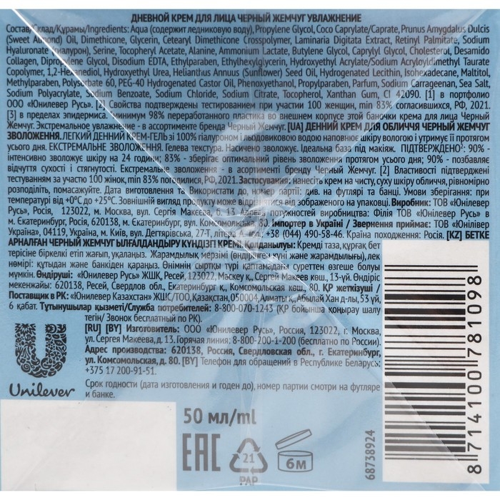 Крем для лица «Чёрный жемчуг. Увлажнение», дневной, 50 мл