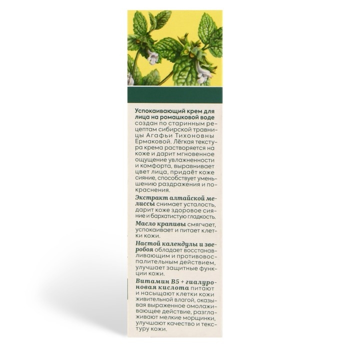 Успокаивающий крем для лица на ромашковой воде создан по старинным рецептам сибирской травницы Агафьи Тихоновны Ермаковой.