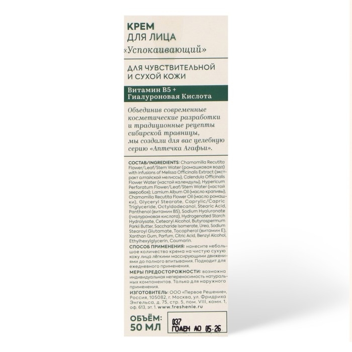 Крем для лица для сухой и чувствительной кожи Аптечка Агафьи "Успокаивающий", 50 мл