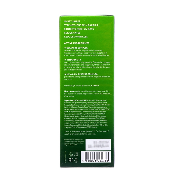 Aqua, UV filters complex / Комплекс УФ-фильтров (Diethylamino Hydroxybenzol Hexyl Benzoate, Ethylhexyl Methoxycinnamate), C12-20 Acid PEG-8 Ester, Ethylhexyl Stearate, Caprylic/Capric Triglyceride, Isohexadecane, Persea Gratissima Oil, Glycerin, Vitis Vinifera Seed Oil, XIAMETER™ PMX-1503 (Dimethicone, Dimethiconol), Ceramide complex / Комплекс церамидов (Deoxyphytantriyl Palmitamide MEA, Hydrogenated Lecithin, Ceramide 3, Cholesterol), Simmondsia Chinensis Seed Oil, Preservative / Консервант (Benzyl Alcohol, Benzoic Acid, Dehydroacetic Acid), Extract Complex/ Комплекс экстрактов (Leontopodium Alpinum Extract, Rubus Idaeus Fruit Extract, Rosmarinus Officinalis Leaf Extract), Sodium Polyacrylate, Integrine-60 (Rice Oligopeptide), EDTA, Parfum.