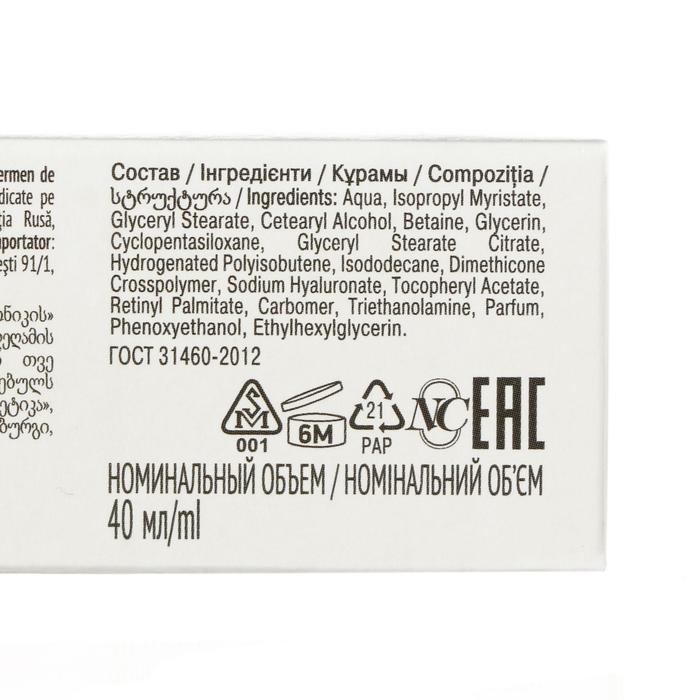 Состав: Aqua, Isopropyl Myristate, Glyceryl Stearate , Cetearyl Аlcohol, Betaine , Glycerin, Cуclopentasiloxane, Glyceryl Stearate Citrate , Hydrogenated Polyisobutene, Isododecane, Dimethicone Crosspolymer, Sodium Hyaluronate, Tocopheryl Аcetate, Retinyl Palmitate, Carbomer, Тriethanolamine, Parfum, Phenoxyethanol, Ethylhexylglycerin.