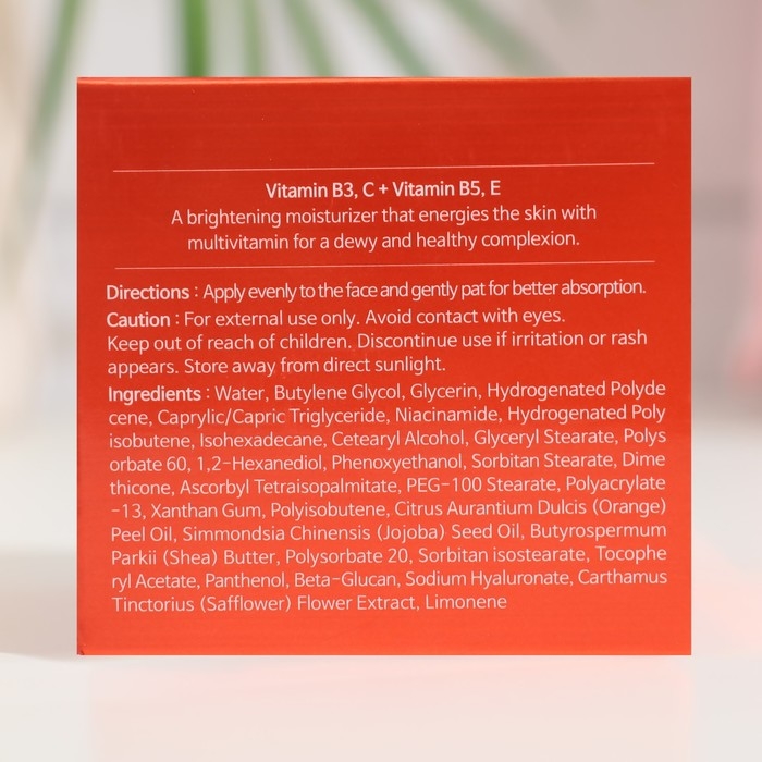 Состав: Water, Butylene Glycol, Glycerin, Hydrogenated Polydecet, Caprylic/Caryl Triglyceride, Niacinamide, Hydrogenated Polyisobutene, Isohexadecane, Stearyl Alcohol, Glyceryl Stearate, Polysorbate 60, 1,2-Hexanediol, Phenoxyethanol, Sorbitan Stearate, Dimethicone, Ascorbyl Tetraisopalmitate, PEG-100 Stearate , Polyacrylate-13, Xanth Gum, Polyisobutene, Orange Peel Oil, Jojoba Oil, Shea Butter, Polysorbate 20, Sorbitan Isostearate, Tocopheryl Acetate, Panthenol, Beta Glucan, Sodium Hyaluronate, Safflower Extract, Limonel.