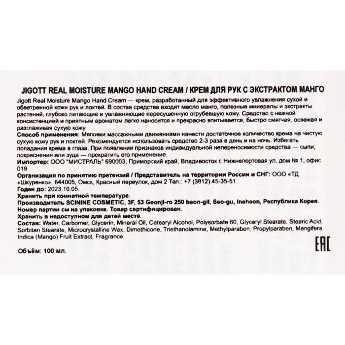 Крем для рук Jigott увлажняющий, с экстрактом манго, 100 мл