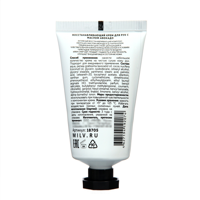 Крем для рук с маслом авокадо восстанавливающий MILV арбуз, 40 мл — это активный восстанавливающий продукт, созданный для ухода за сухой, шелушащейся и чувствительной кожей в период межсезонья, особенно при изменениях температуры и сухости воздуха. Вот основные компоненты и свойства этого крема:
