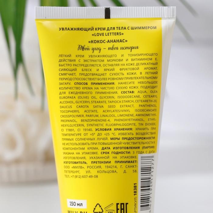 Увлажняющий крем для тела с шиммером «Love letters» с ароматом «Кокос-ананас» быстро распределяется, оставляя на коже деликатный сияющий блеск и яркий фруктовой аромат.