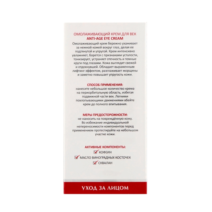 Состав: Аqua, Vitis Vinifera (Grape) Seed Oil, Ethylhexyl Stearate, Glycerin, Hydroxyethyl Acrylate/Sodium Acryloyldimethyl Taurate Copolymer, Squalane, Caffeine, DMDM Hydantoin, Polysorbate 60, Xanthan Gum, Phenoxyethanol (And) Ethylhexylglycerin, Parfum.