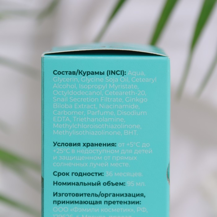 Состав: Aqua, Carbomer, Isopropyl Myristate, Dimethicone, Snail Secretion Filtrate, Centella Asiatica Extract, Sodium Alginate, Parfum, Disodium EDTA, Potassium Hydroxide, Methylchloroisothiazolinone (and) Methylisothiazolinone.
