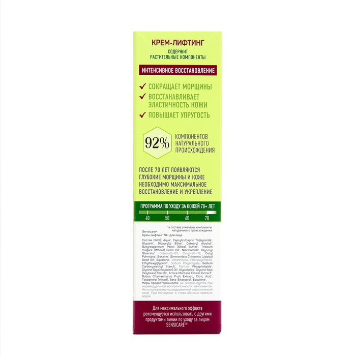 Крем-лифтинг для лица дневной и ночной Sensicare 70+ - это мощное средство для борьбы с возрастными изменениями кожи. Этот крем разработан специально для зрелой кожи, чтобы улучшить ее текстуру, уменьшить морщины и пигментные пятна.