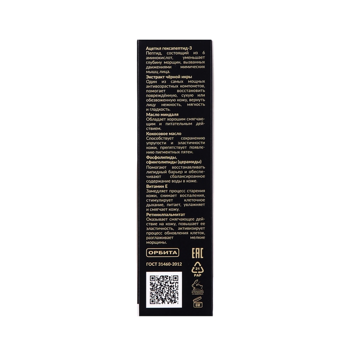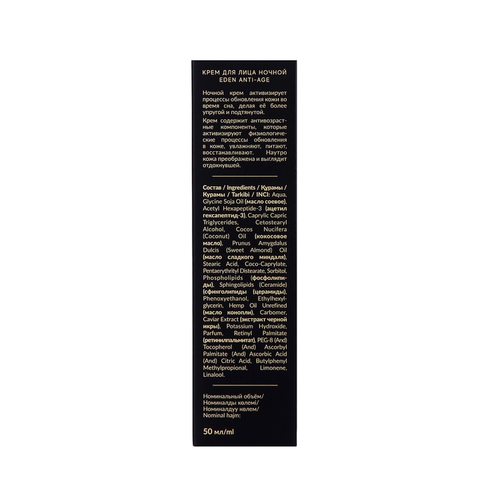 Состав: Aqua, Glycine Soja Oil (масло соевое), Acetyl Hexapeptide-3 (ацетил гексапептид-3), Caprylic Capric Triglycerides, Cetostearyl Аlcohol, Cocos Nucifera (Coconut) Oil (масло кокосовое), Prunus Amygdalus Dulcis (Sweet Almond) Oil (масло сладкого миндаля), Stearic Acid, Coco-Caprylate, Pentaerythrityl Distearate, Sorbitol, Phenoxyethanol, Ethylhexylglycerin, Carbomer, Caviar Extract (экстракт черной икры), Hemp Oil Unrefined (масло конопли), Phospholipids (фософолипиды) , Sphingolipids (Ceramide) (сфинголипиды (церамиды) , Potassium Hydroxide, Parfum, PEG-8 (And)Tocopherol (And) Ascorbyl Palmitate (And) Ascorbic Acid (And) Citric Acid, Retinyl Palmitate (ретинилпальмитат), Butylphenyl Мethylpropional, Limonene, Linalool