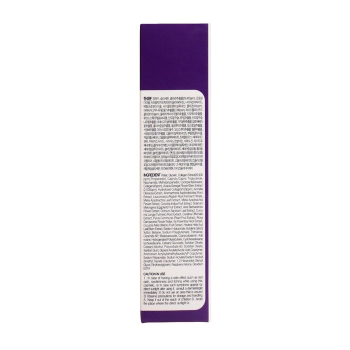 Состав: Water, Glycerin, Collagen Extract (29,400 ppm), Propandiol, Caprylic/Capric Triglyceride, Niacinamide, Methylpropandiol, Cyclopentasiloxane, Collagen (45 ppm), Acacia Senegal Flower/Stem Extract (2,000 ppm), Hydrolyzed Collagen (100 ppm), Acmella Oleracea Extract, Anemarrhena Asphodeloides Root Extract, Leuconostoc/Radish Root Ferment Filtrate, Melia Azardirachta Leaf Extract, Melia Azardirachta Flower Extract, Coccinia Indica Fruit Extract, Solanum (Eggplant) Fruit Extract, Aloe Barbadensis Flower Extract, Ocimum Sanctum Leaf Extract, Curcuma Longa (Turmeric) Root extract, Corallina Officinalis Extract, Pyros Communis (Pear) Fruit Extract, Rosa Damascena Flower Water, Iris Florentiana Root Extract, Cucumis Melo (Melon) Flower Extract, Hedera Helix (Ivy) Leaf/Stem Extract, Sodium Hyaluronate, Butylene Glycol, Xyliton, Sodium Polyglutamate, Trehalose, Ceramide NP, Madecassoside, Cyanocobalamin, Adenosine, Hydrogenated Polyisobutene, Cyclohexasiloxane, Isohexadecane, Ceteryl Glucoside, Sorbitan Olivate, Ceteryl Alcohol, Polysorbate 80, Sorbitan Oleate, Xanthan Gum, Glyceryl Acrylate/Acrylic Acid Copolymer, Ammonium Acryloyldimethiltaurate/VP Copolymer, Sodium Polyacrylate, Sodium Acrylate/Sodium Acryloyldimethyl Taurate Copolymer, 1,2-hexanediol, Benzil Glycol, Ethylhexylglycerin, Raspberry Ketone, Disodium EDTA.
